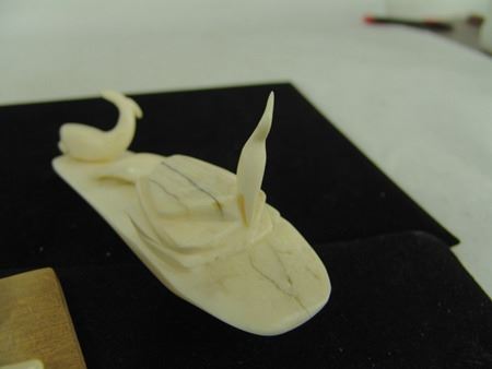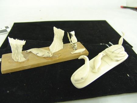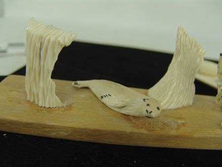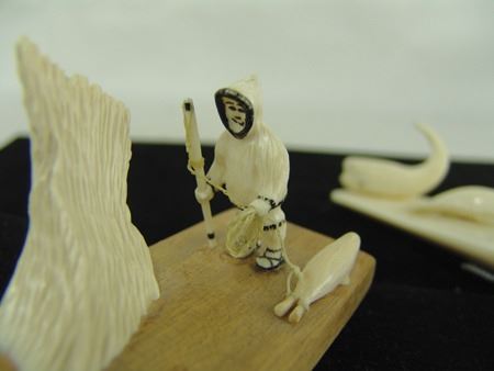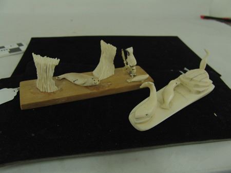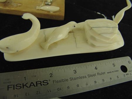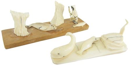 Mid/Late 1900s, Includes a scene of a seal hunter, seal and baby seal by Carol O.I.Yakitan, and a three-figure scene with small whale, baby seal, and bird that is unsigned. Both in very good condition. 7", 6"