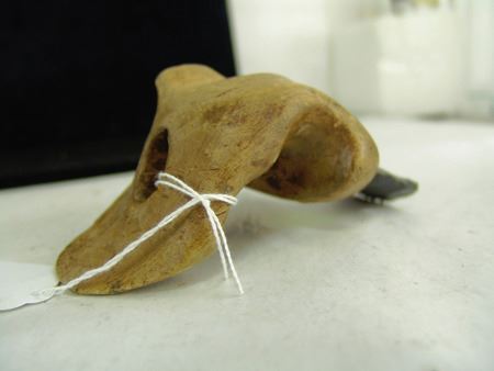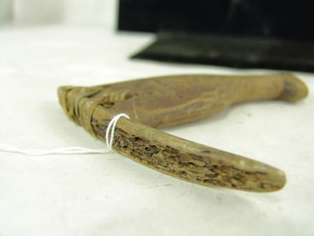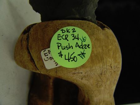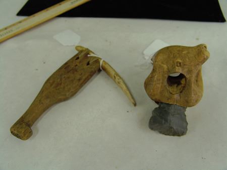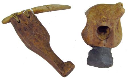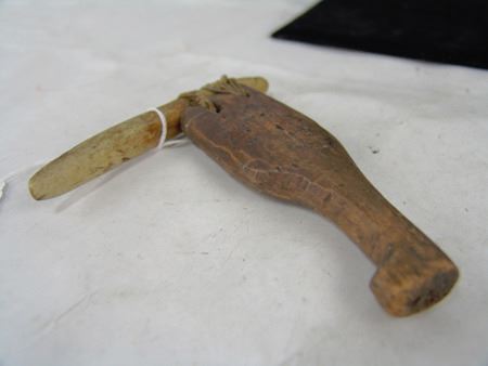 Late1800s/Early/Mid 1900s, Pair of rare hand tools including a wooden digger with a sinew laced carved bone blade and carved driftwood push adze with knapped blade (not original), both with great patina. Good condition. 5-1/2" & 5"