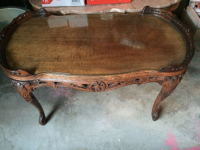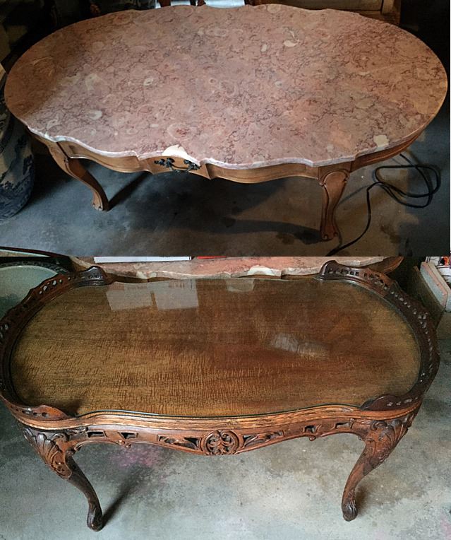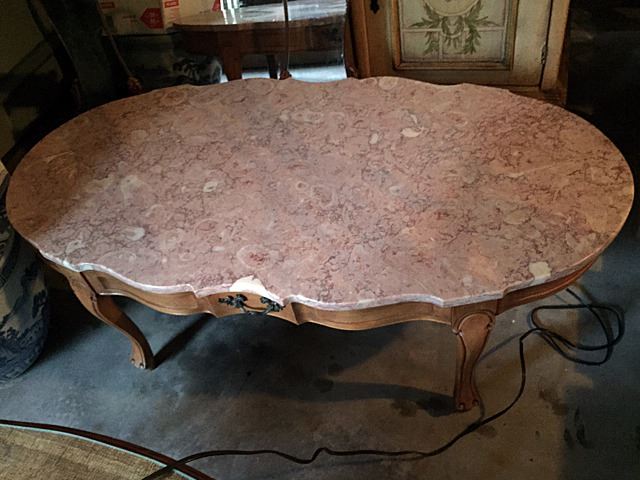 2 estate coffee tables, one has pink marble top, c. 1920's.