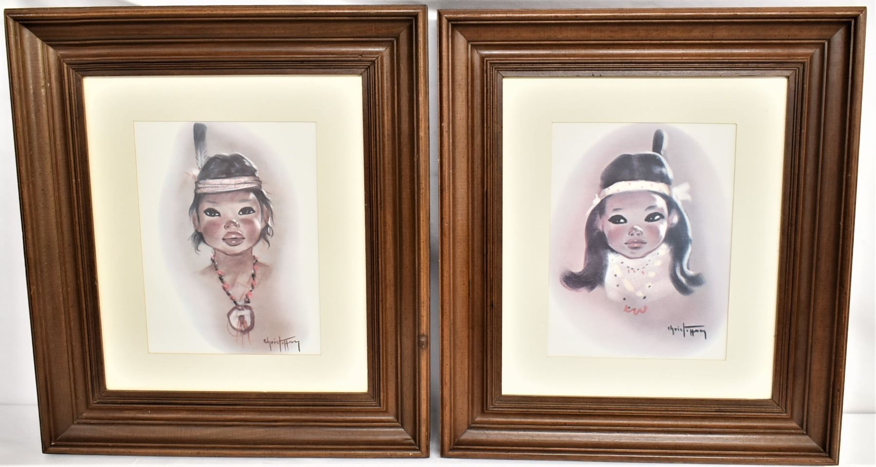 Pair of Estate Framed Gerda Christoffersen (1917-2012) Prints, under glass and matted, visual measures 10'' x 7.5'', and overall framed measurement of 19'' x 16.5'', Native American Children subject matter, FYI: ''Gerda Christoffersen (early 20th century) was active/lived in Montana / Canada, Denmark. Gerda Christoffersen is known for Indian portrait, papoose paintings.''