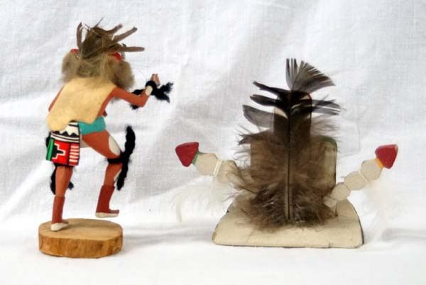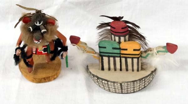 From the Whittredge Estate, we have 2 Native American Hopi Kachinas, the Ogre Kachina is by Coolidge Roy and measures 5''H x 2.5''W and is signed by artist, both are embellished with feathers, FYI: Coolidge Roy Jr. and his wife Juanita live on Third Mesa in Oraibi, Arizona. Coolidge has long been famous for his magnificently beautiful Eagle Dancer Kachina dolls. Coolidge's father was a carver as are his brothers and sons. Fine examples of Coolidge's work can be found in most books on Hopi art including Hopi Kachina Dolls and their carvers by Theda Bassman, and Erik Bromberg's The Hopi Approach to the Art of Kachina Doll Carving. Coolidge was born on August 4, 1950 and has been carving for well over 30 years. His work is well-known and can be recognized easily because of his unique style. One of the most noticeable aspects of his carvings is the ''natural'' coloration that he achieves by using only very faint pigments.