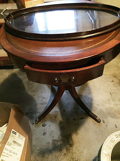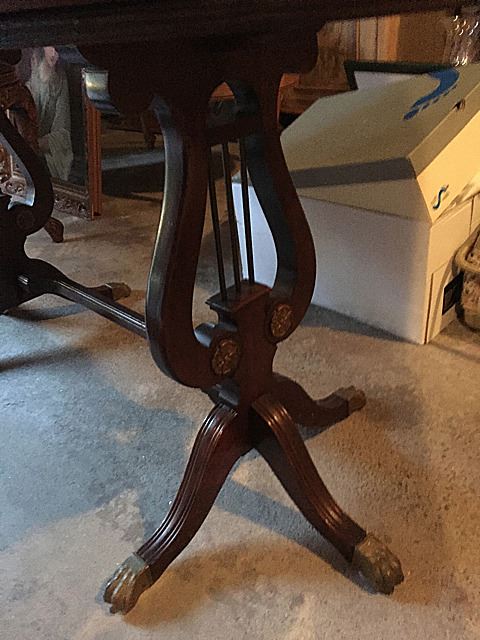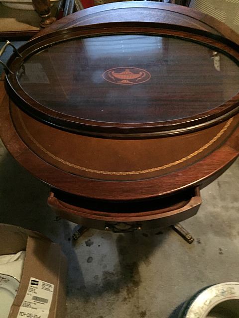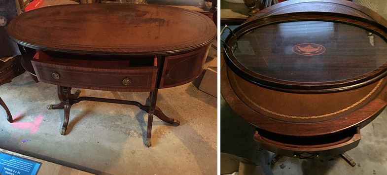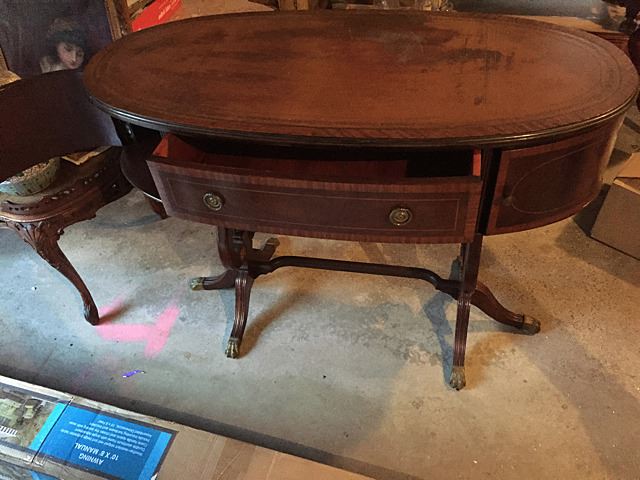 2 Estate tables. Double pedestal entranceway table, Ducan Fife, with lyre music ends, oval, the ends open up, 1 drawer drawer. Very nice entranceway table. Leather top table with 1 drawer, c. 1920-40 and nice wood and glass serving tray with lantern inlay.