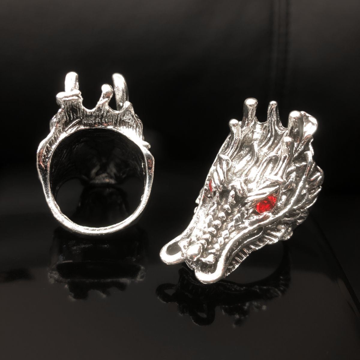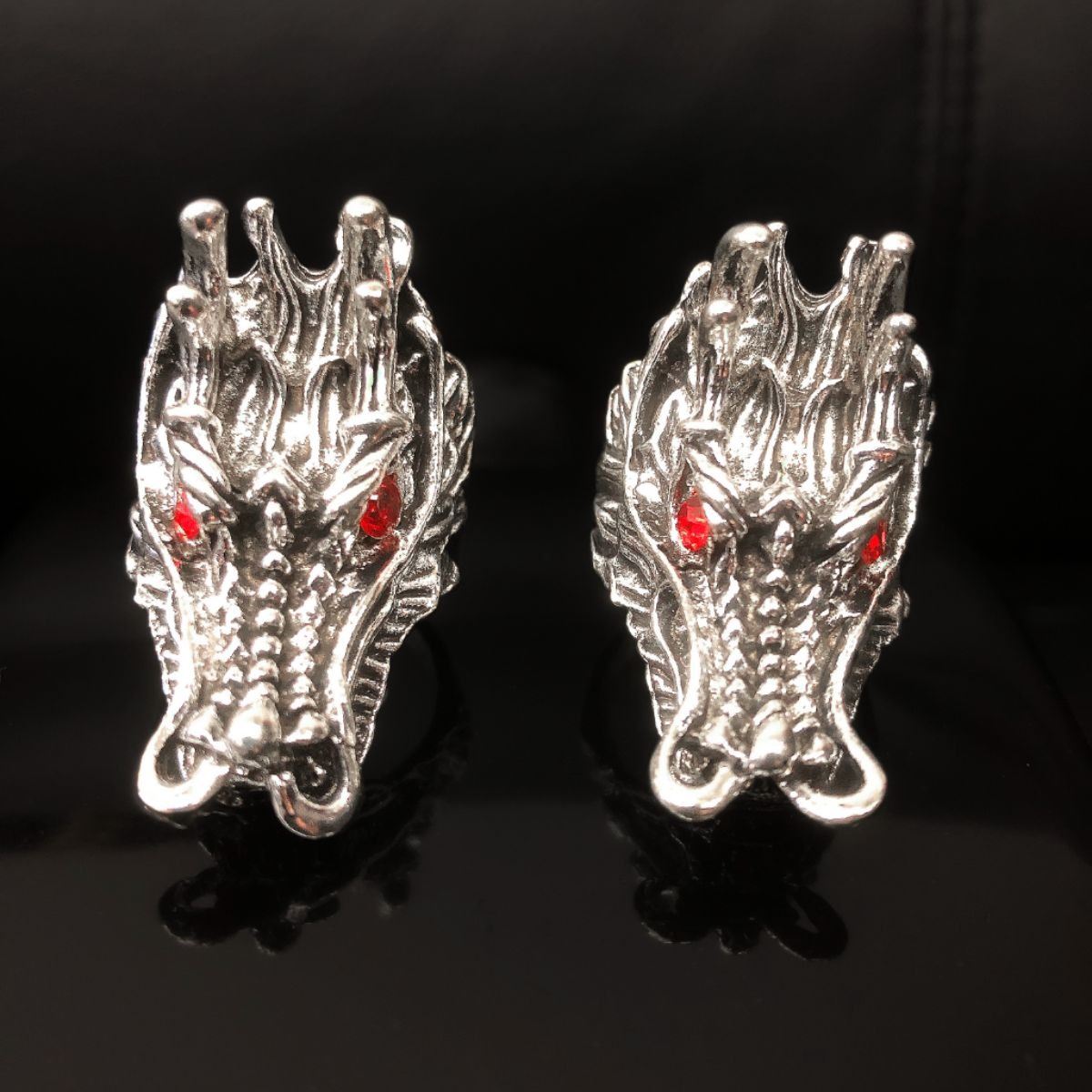 2 Large Exquisite Chinese Miao Silver Handmade Red Eye Dragon Head Rings, Great Attention To Details. Comes with box. See Photos for further inspection. Â