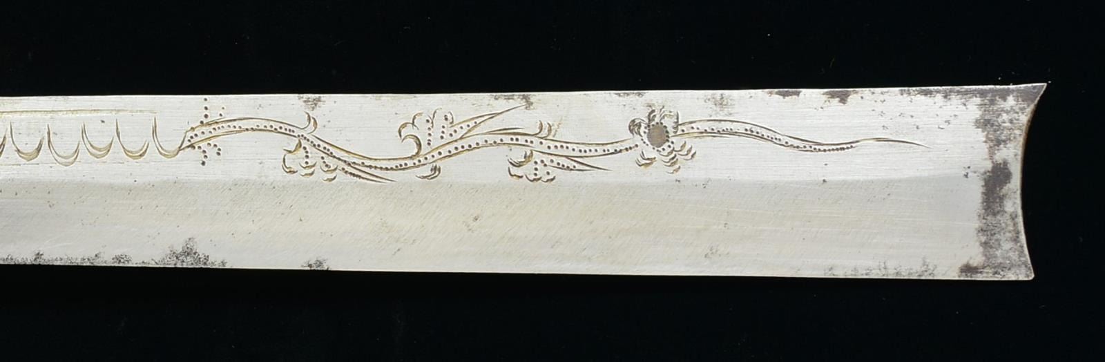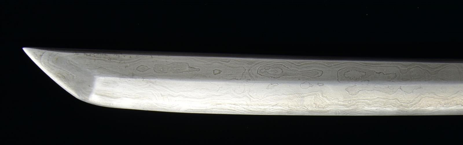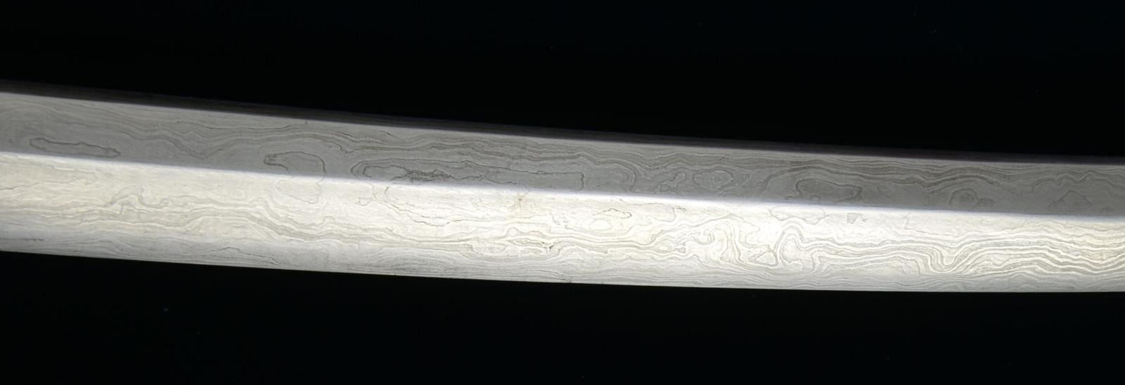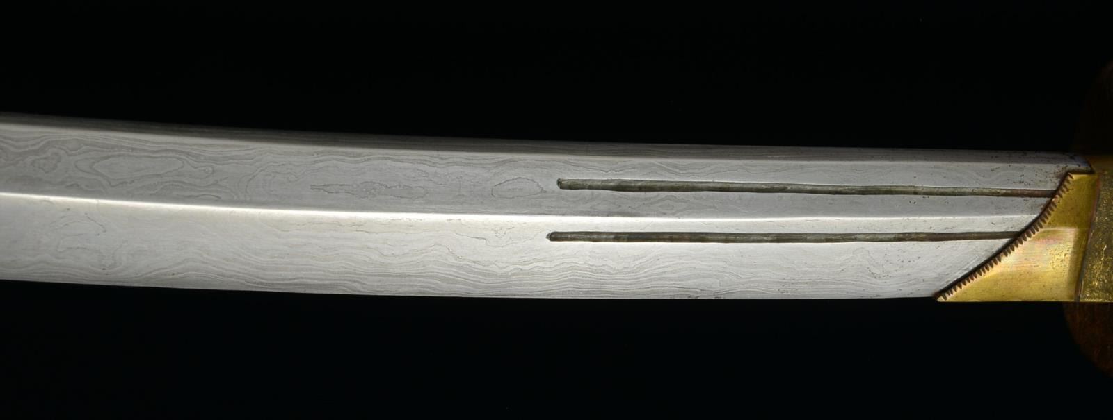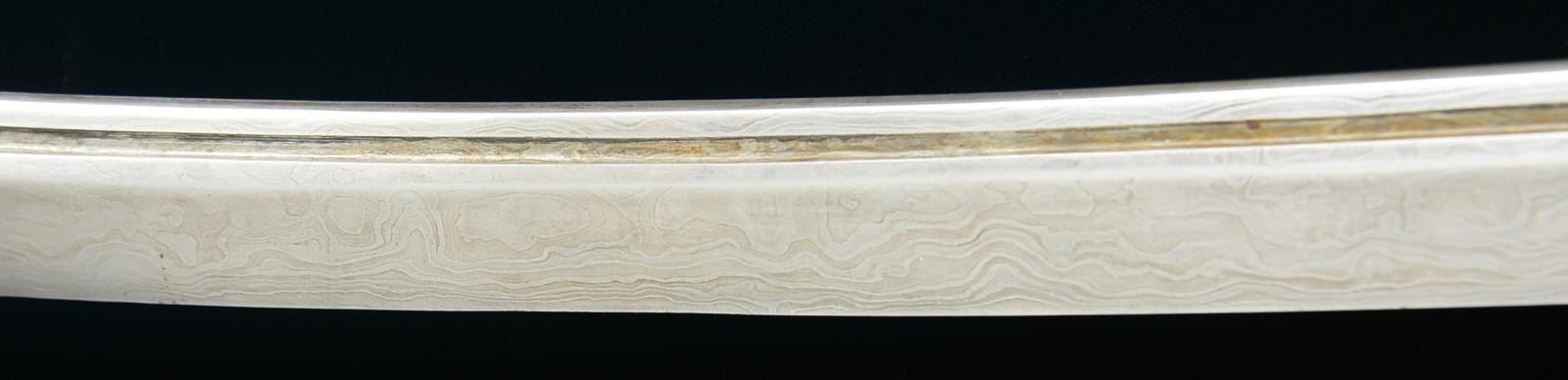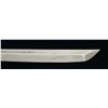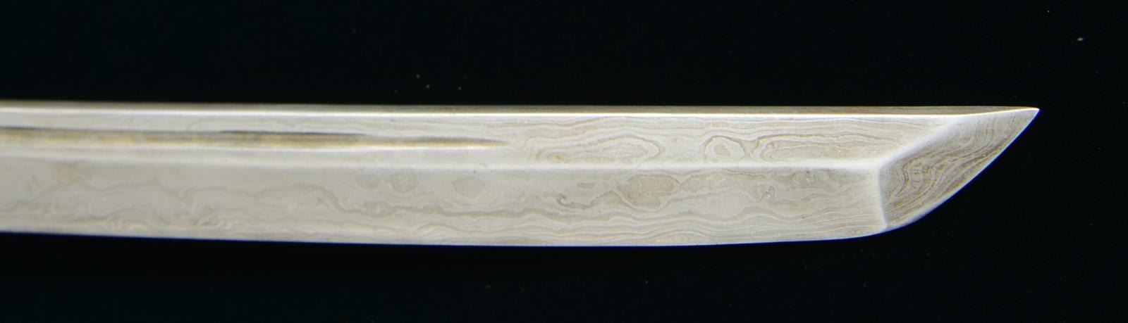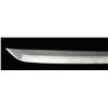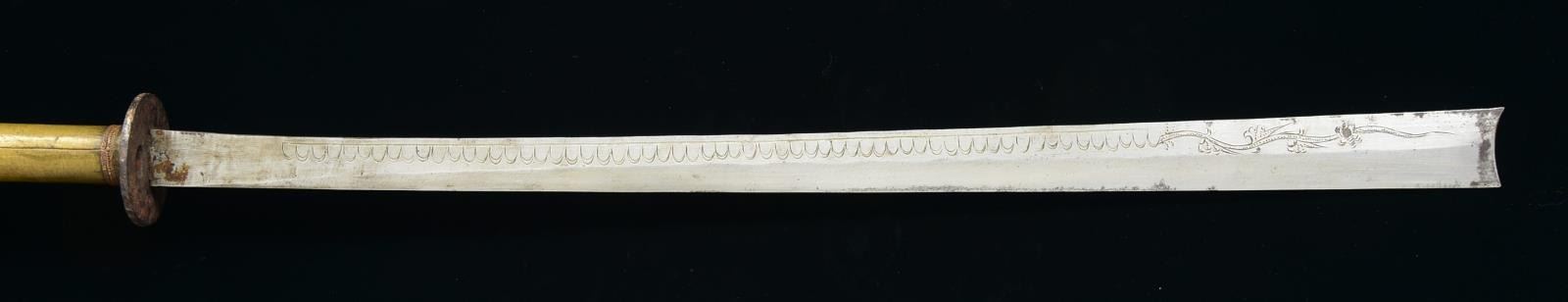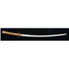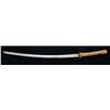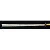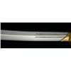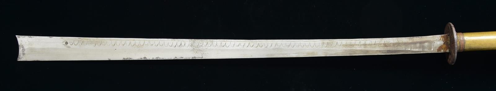 1) JAPANESE STYLE KATANA. Overall length: 43". Blade length: 30 1/2". Blade has a single, long narrow fuller on 1 side & 2 short, narrow fullers on the other side. The steel has easily discernible fold marks & patterning. Brass habaki of a pointed form. Iron tsuba w/ silvered wolf, bear & bird applied. There is 1 seppa below the tsuba. The fuchi & kashira are shaped brass. Tsuka-ito is multicolored flat braid. Nakago has a 6 character signature on both sides w/ a single mekugi-ano. Saya is brass covered wood w/ incised designs throughout. CONDITION: blade has a nice finish. Tsuka is worn. Saya is complete & has a deep early patina. (02-15118/BF). 2) THAI OR FAR EAST SABER. Overall length: 33 1/2". Blade length: 24 3/4". Blade has a slightly concave flattened tip & has hammered decoration below the spine. Round iron tsuba. Brass hilt w/ copper wire woven central decoration. Wooden scabbard w/ jute wrap. There is an alternate, modern made, storage scabbard included. CONDITION: blade shows light wear. Hilt & scabbard show moderate wear. (02-15119/BF). $450-700.