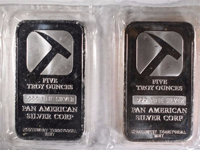 2-FIVE OUNCE .999 SILVER BARS-PAM AM SILVER CORP ESTIMATE $230 - $250.