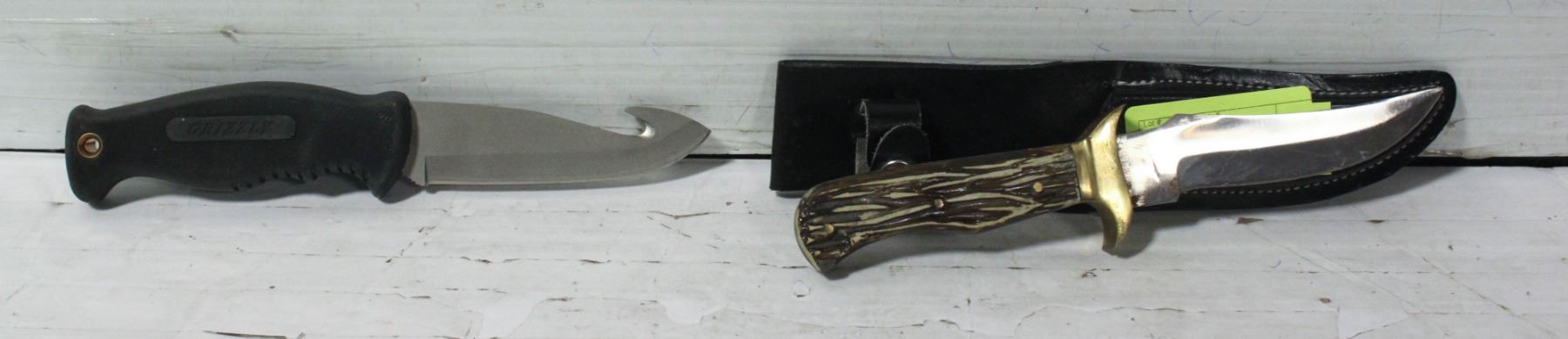 GRIZZLY SKINNING KNIFE WITH GUT HOOK, CARVED WOOD HANDLE WITH LEATHER SHEATH