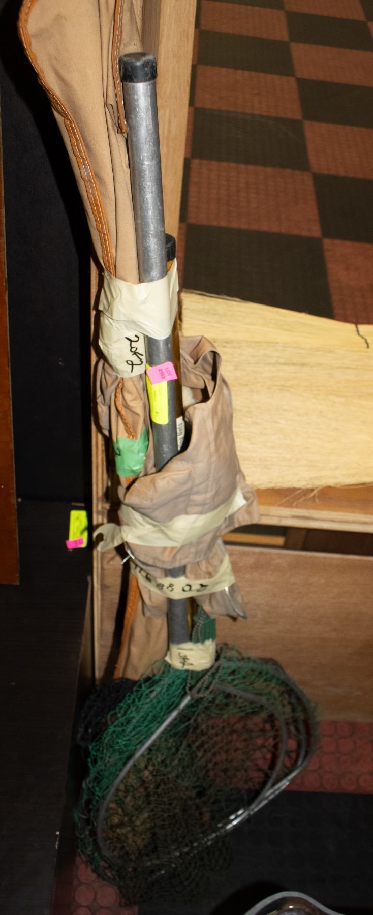 2 FLYRODS AND REELS, FISHING VEST, 3 NETS,