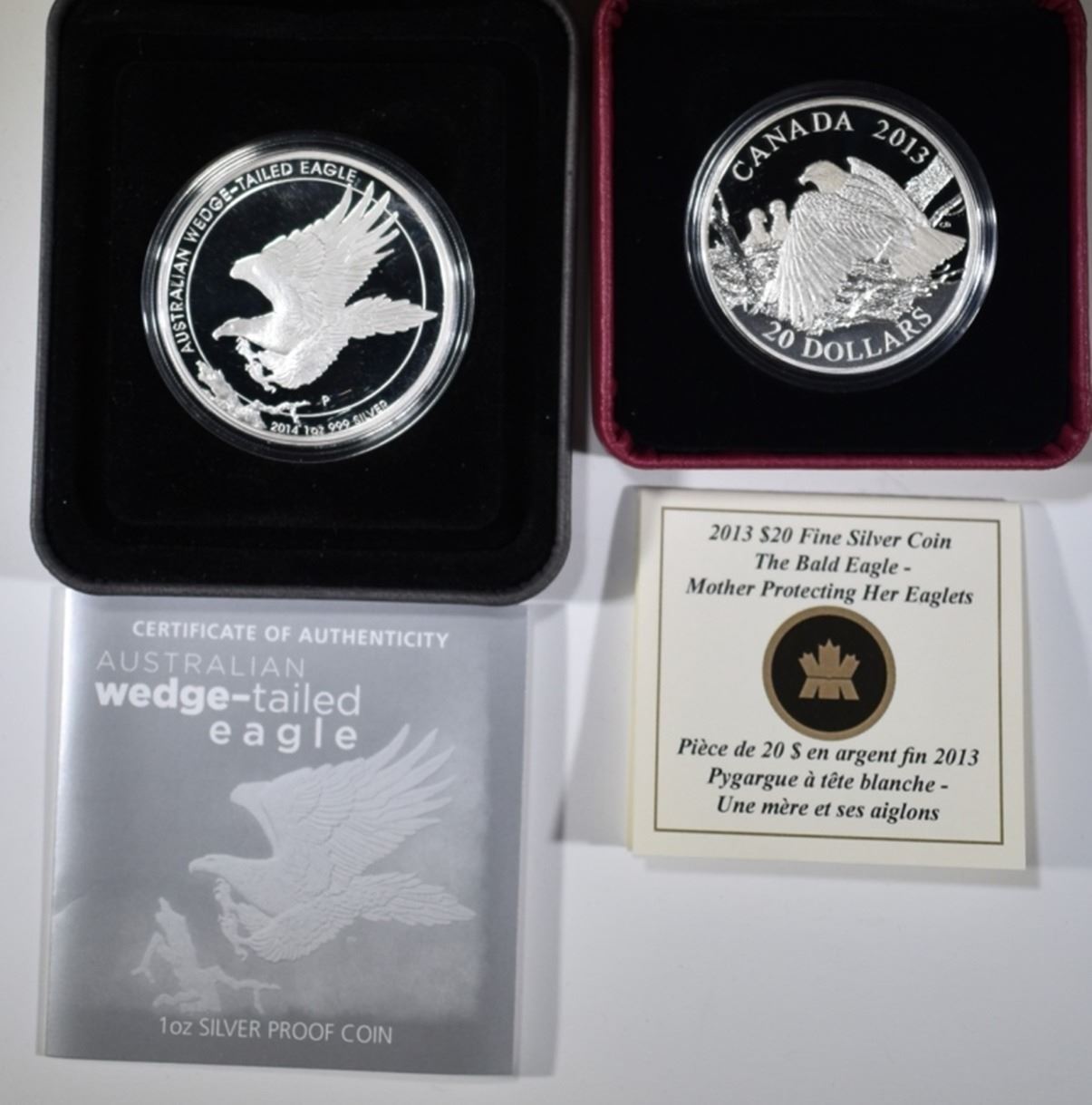 2012 $20 CANADA BALD EAGLE - MOTHER PROTECTING HER EAGLETS & 2014 AUSTRALIAN WEDGE-TAILED EAGLE. ESTIMATE $100 - $125.