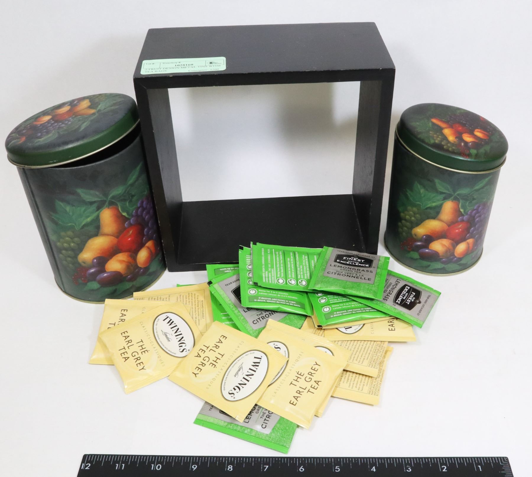 (TWINGING'S EARL GREY NO EXPIRY FOUND AND OUR FINEST LEMONGRASS GREEN TEA NO EXPIRY FOUND) SOLD WITH SMALL BLACK SHELF. APPROX. 8"X8"