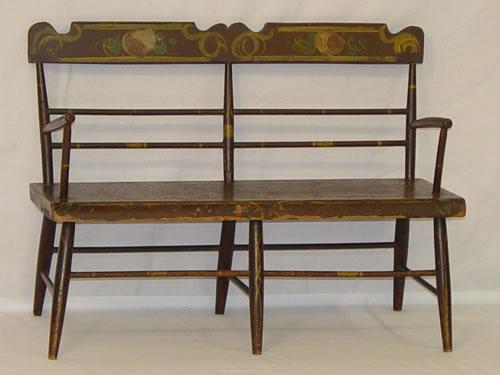 2 FT. 19TH CENT. PA STYLE DOLLS SETTEE W/ SHAPED CREST IN OLD RED-BROWN PAINT W/ PAINTED FLORAL DECORATION W/ YELLOW HIGHLIGHTS - PAINT LOSS, REPAIRS, & IMPERFECTIONS
