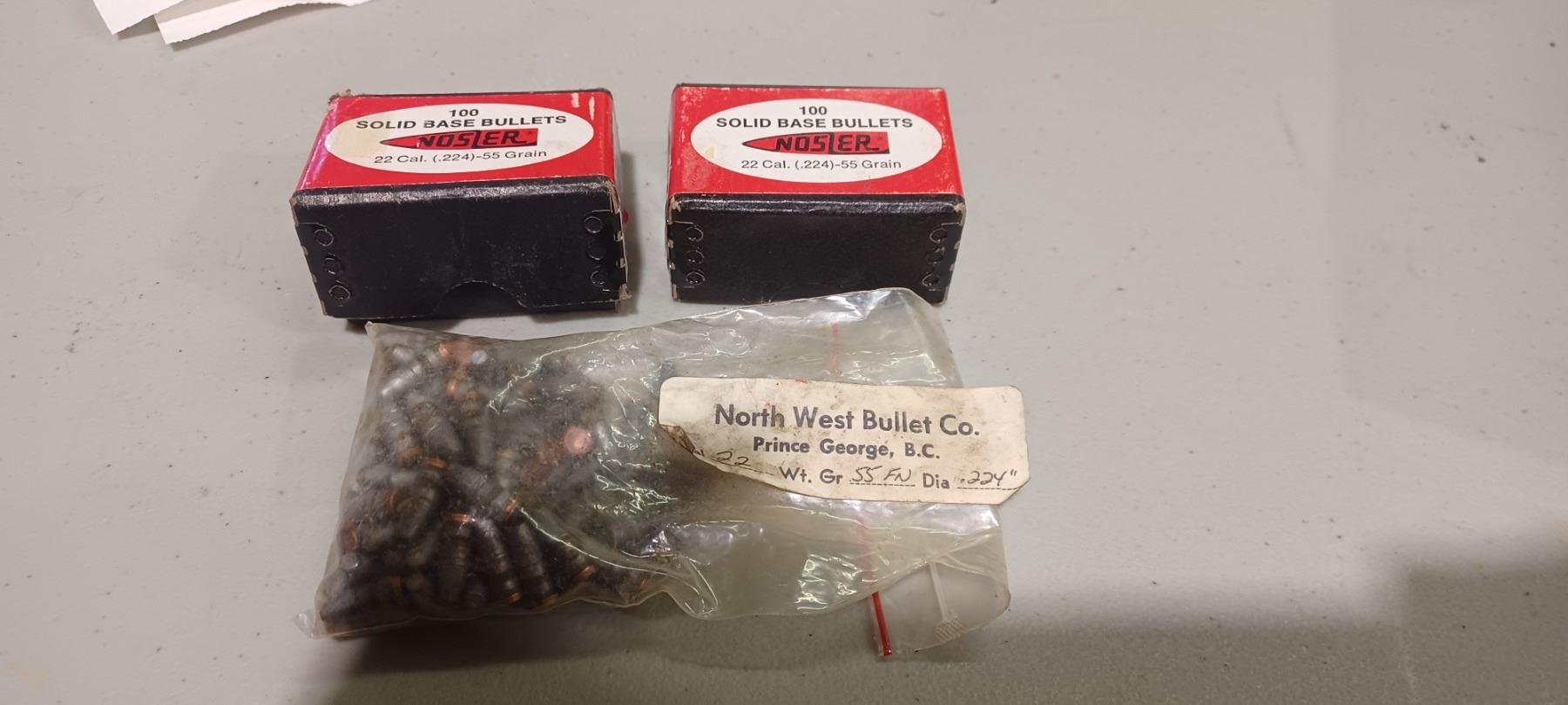 2 FULL BOXES OF NOSLER 22 CAL 55 GRAIN BULLETS AND BAG OR NORTHWEST 22 55 GR FN BULLETS