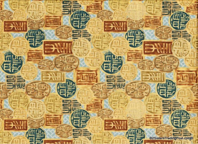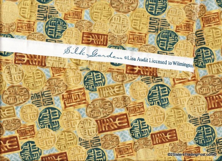 Two fat quarters of 'Silk Garden by Lisa Audit licensed to Wilmington Prints 100% cotton fabric. Fabric has an oriental print in golds, browns & blues on a light blue grey background each piece measures 20" long x 22 wide.