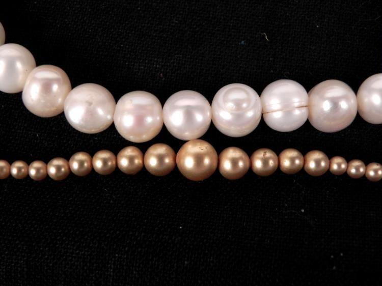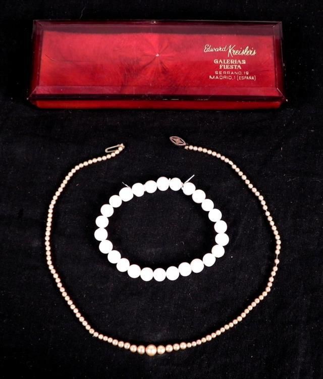 Here are two faux pearl strands, both in excellent condition. One is a vintage 1929 necklace from Edward Kreisler's Galerias in Madrid, and it comes in the original plastic box. It is 13" long. The other is a bracelet on elastic, about 7" around.