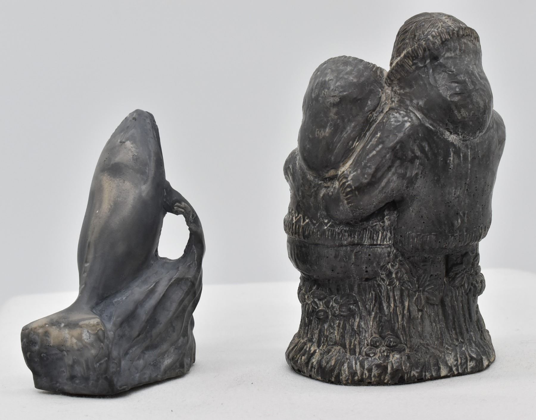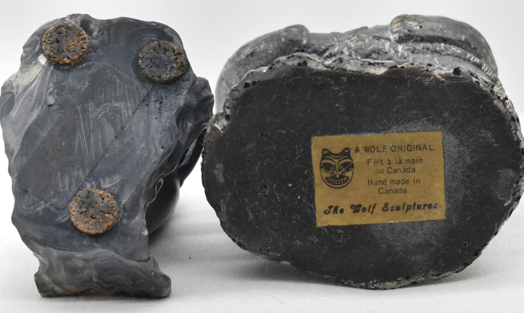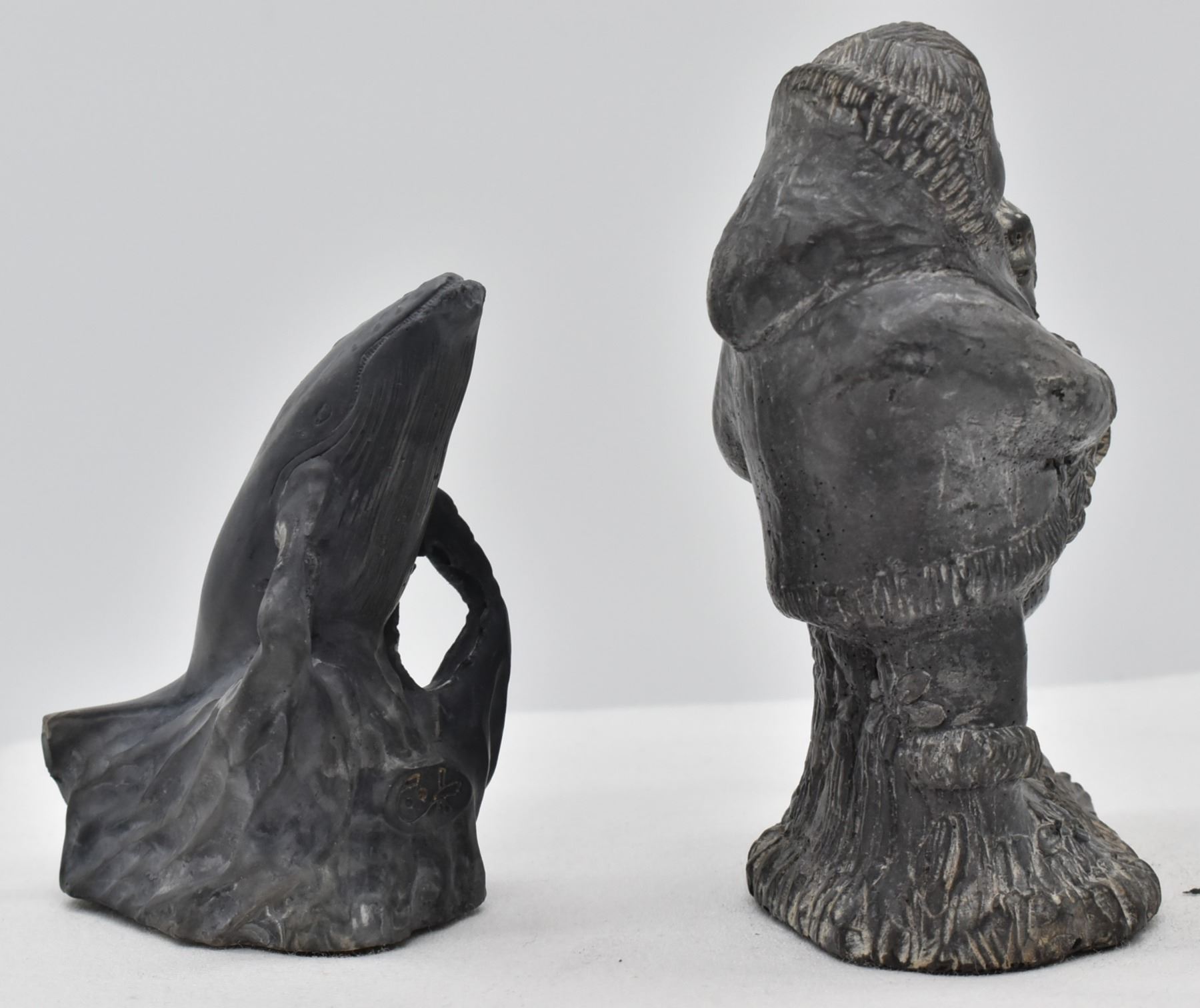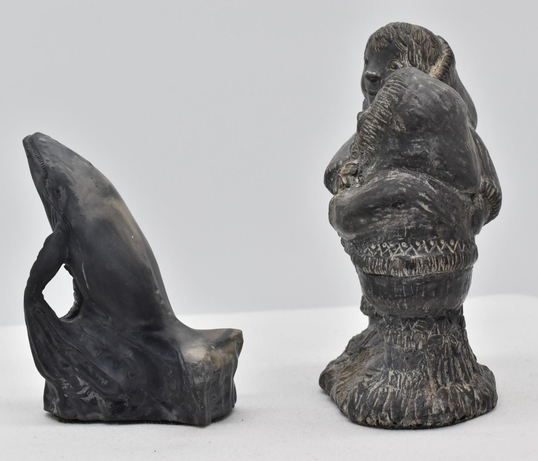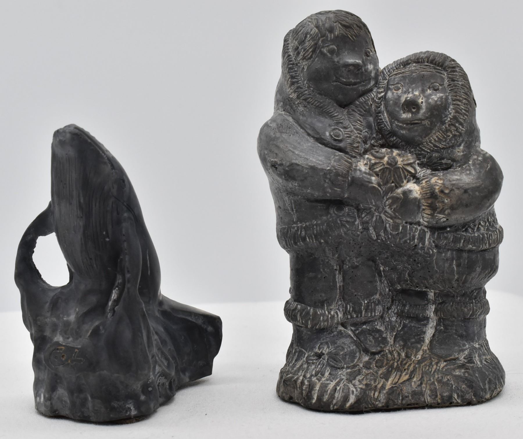 2 Figurines, includes 1. Wolf Original Sculpture of 2 Inuits, largest measuring 2.5'' x 4.5'' and has original gold foil label on the bottom 2. Breaching Whale Sculpture