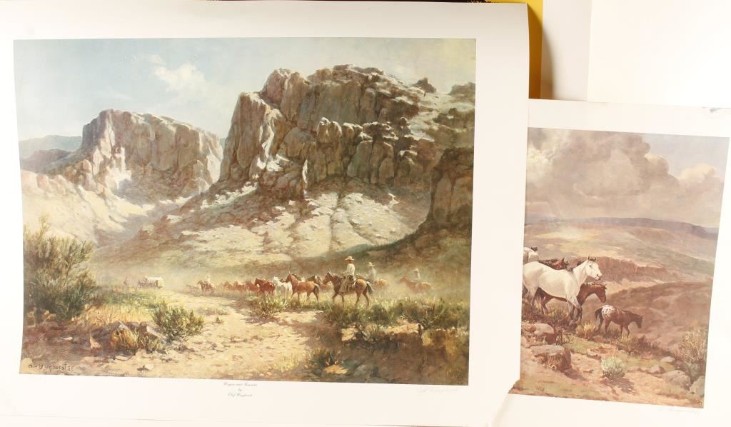 1 titled "His Wealth" 226/1000, of cowboy and horses on range-measures 21 1/2"x16, and "Wagon & Remuda"-travelers covered wagon going down a trail-measures 27 1/2"x20 1/4" water damage and corner is missing.