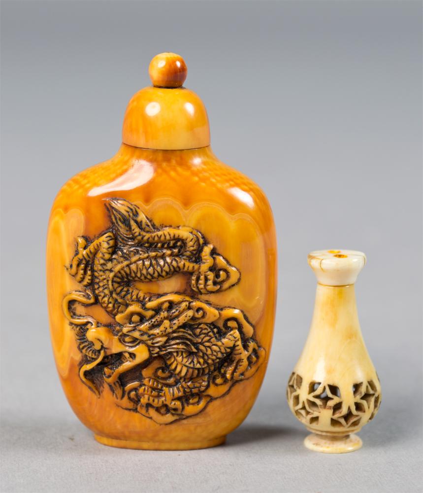 To include a miniature ivory vase with open work carving and removable top together with a miniature ivory snuff bottle finely carved to depict a dragon on one side the reverse with etched calligraphy and signature tallest is 2"H both in fitted boxes circa early 20th century.