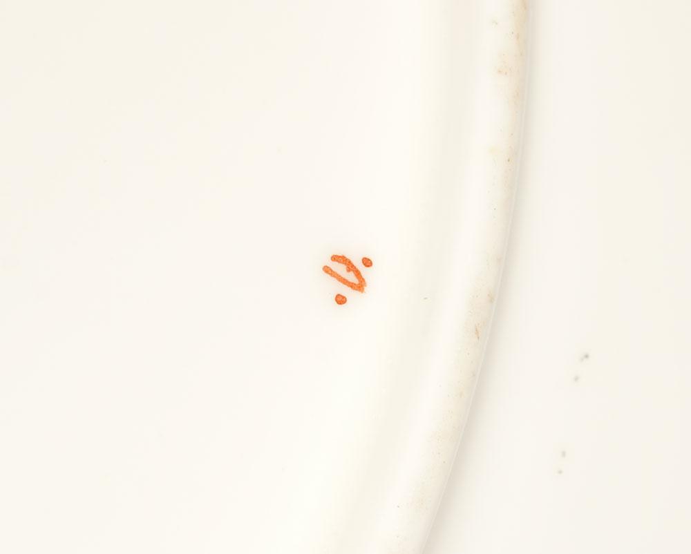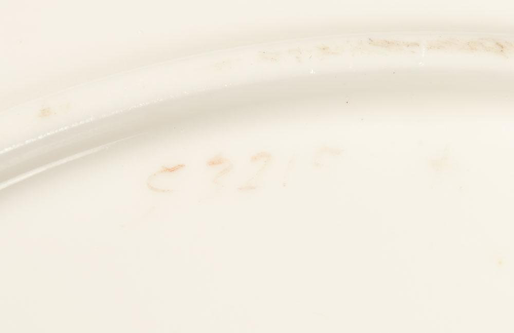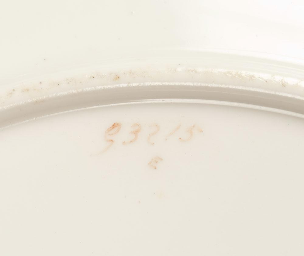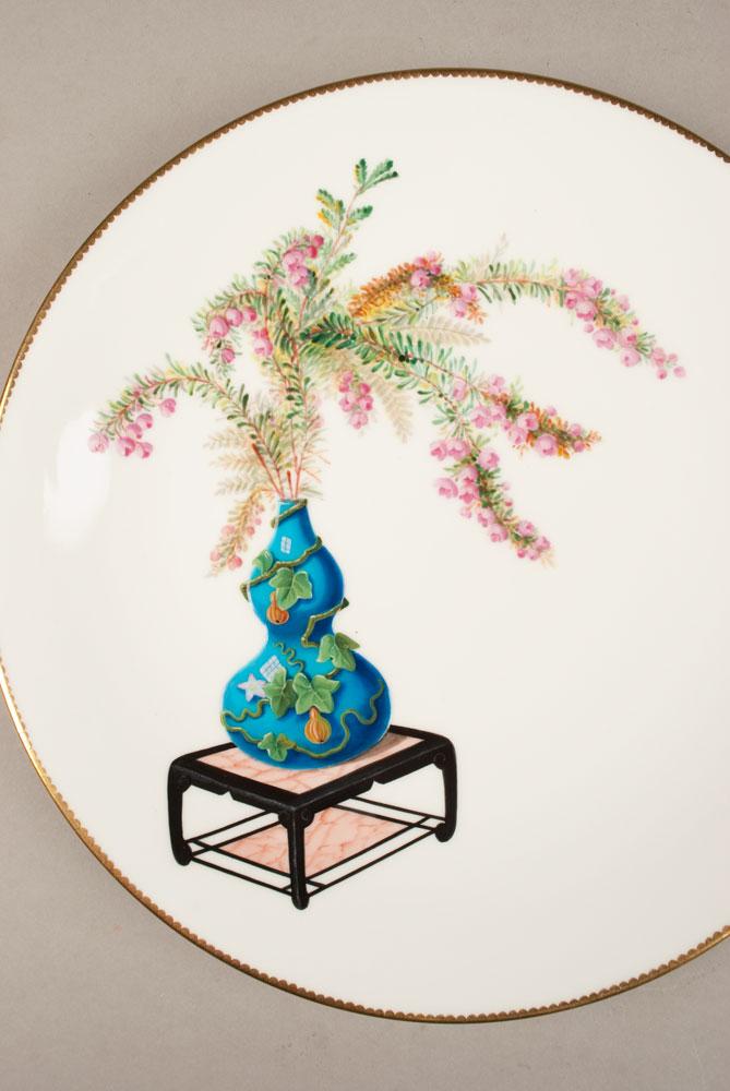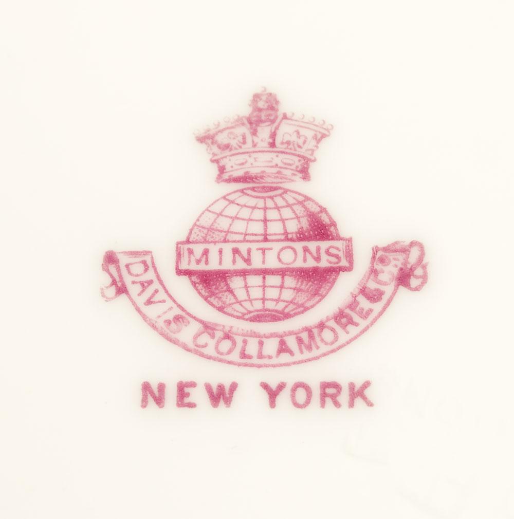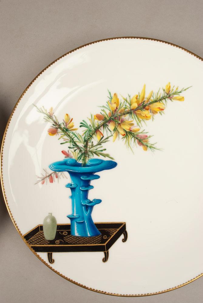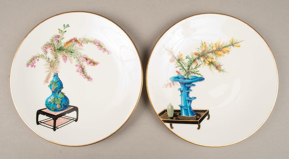 Both decorated in the Chinese taste, one finely enameled to depict a gourd vase with apple blossoms on a lacquered, the rim richly gilded with zig-zag pattern. The second plate finely enameled to depict a lingzi shaped vase with flowers on a gilt decorated lacquered stand, the rim richly gilded in zig-zag pattern. Signed on back with Minton's stamp, Davis Collamore & Co. N.Y.~probably the retailer, with impressed mark of Minton's. Each 9.5" Dia., both extremely nice.