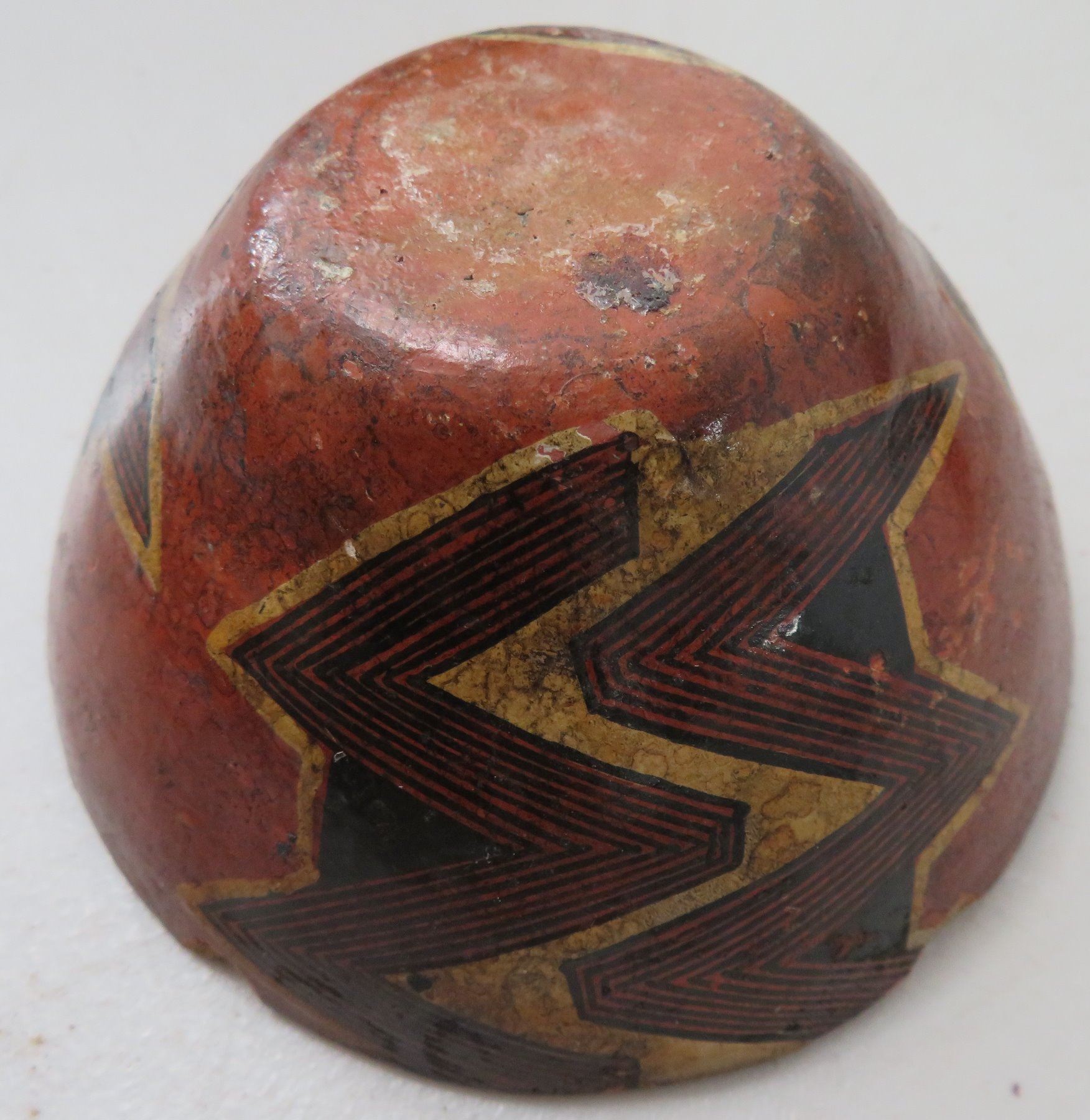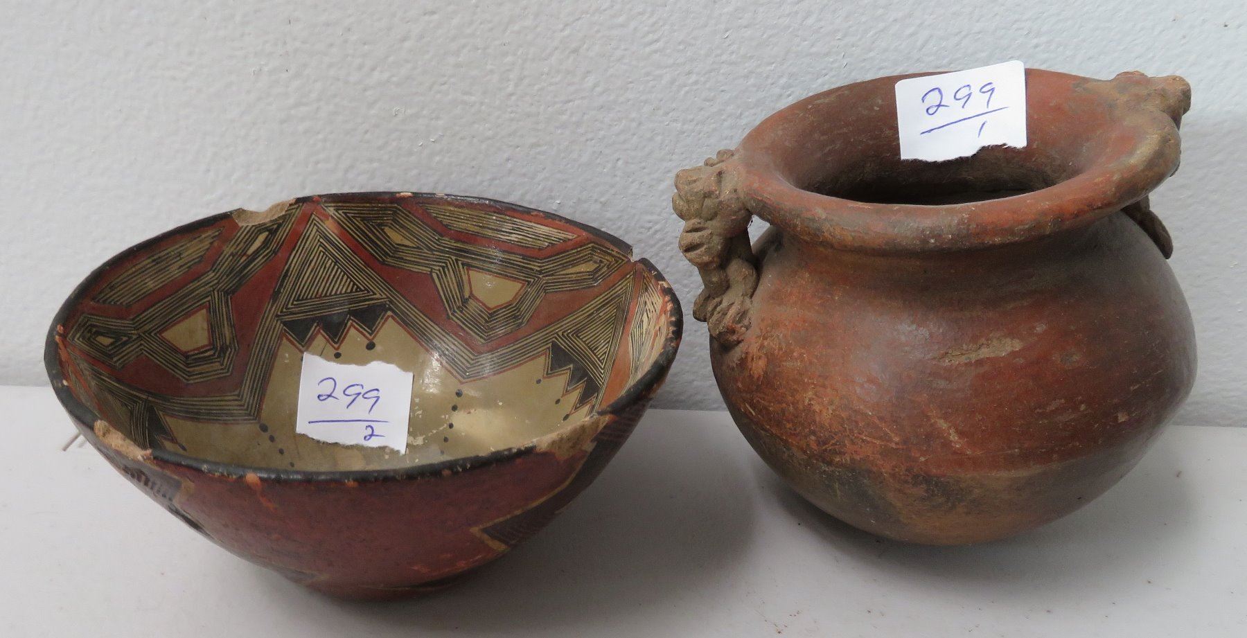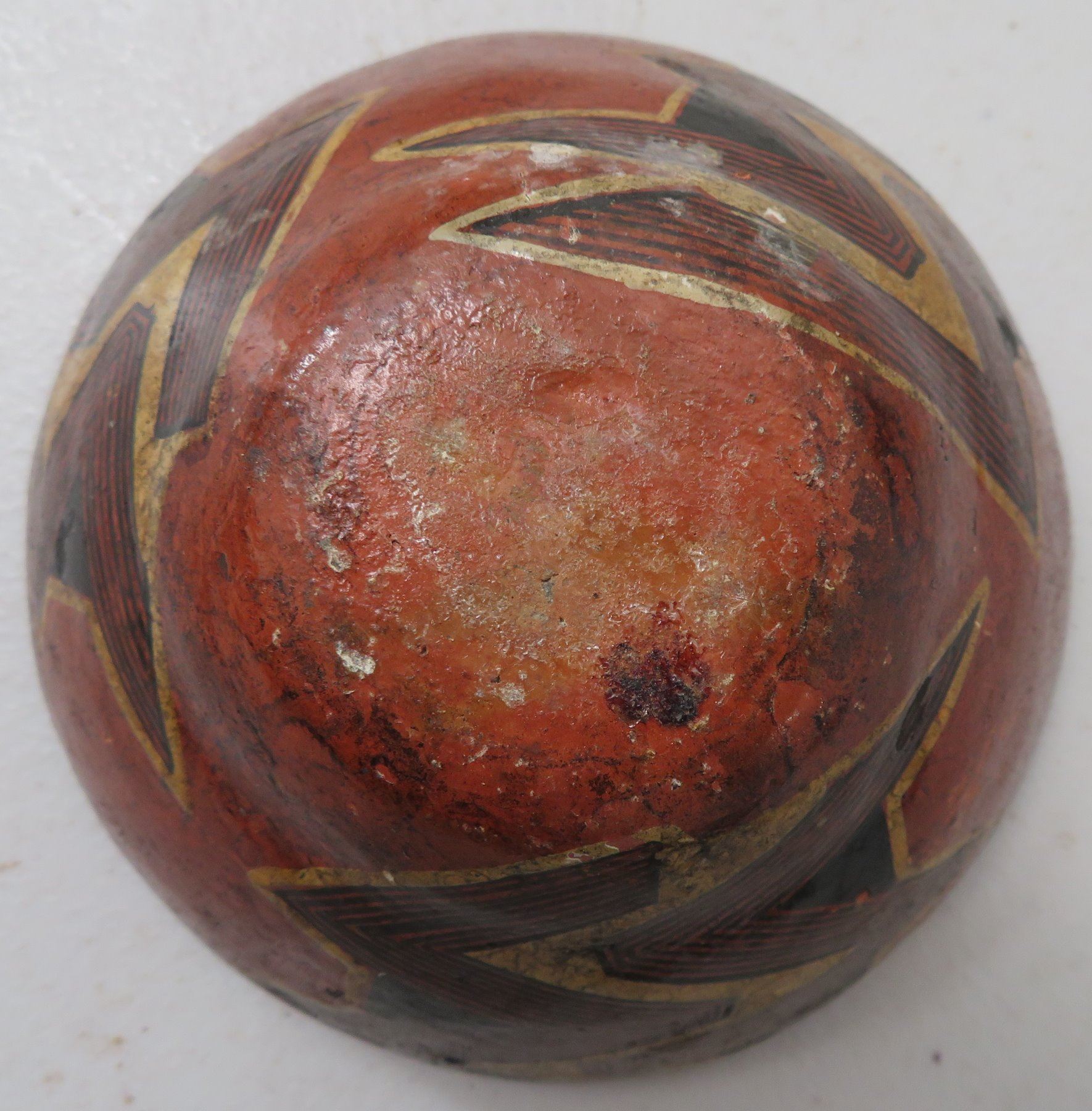 2 Fine Pre-Columbian Bowls, pre-Columbian items. Made of clay and paint, the largest measures 4 1/2". South America. Fine lining on bowl. Condition: Minor chips, see images. Shipping: $26.50 w/insurance and signature.