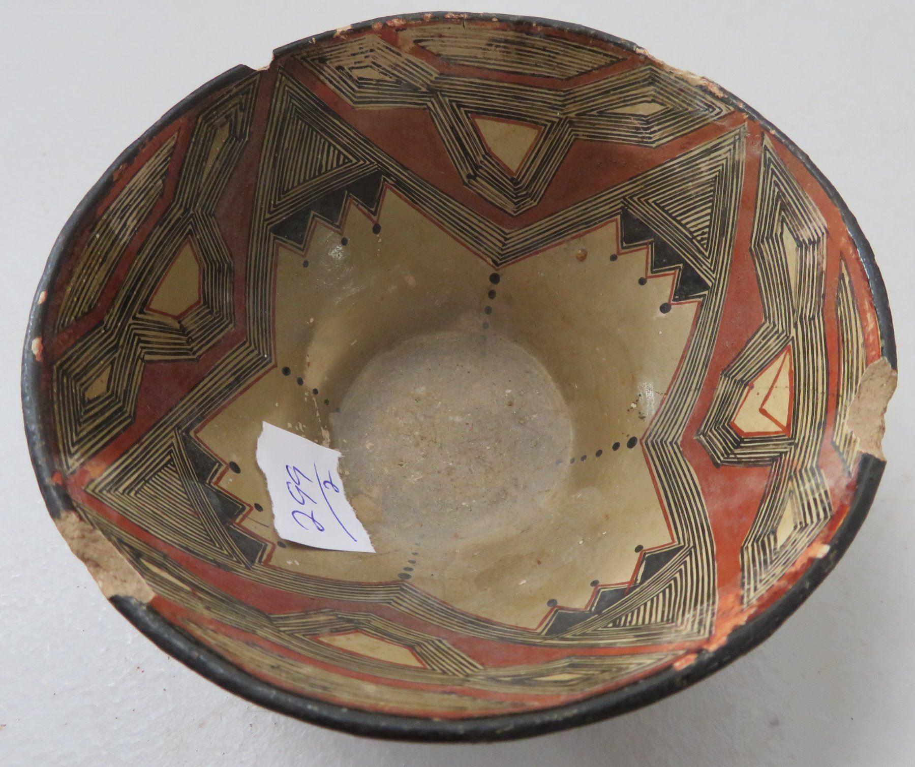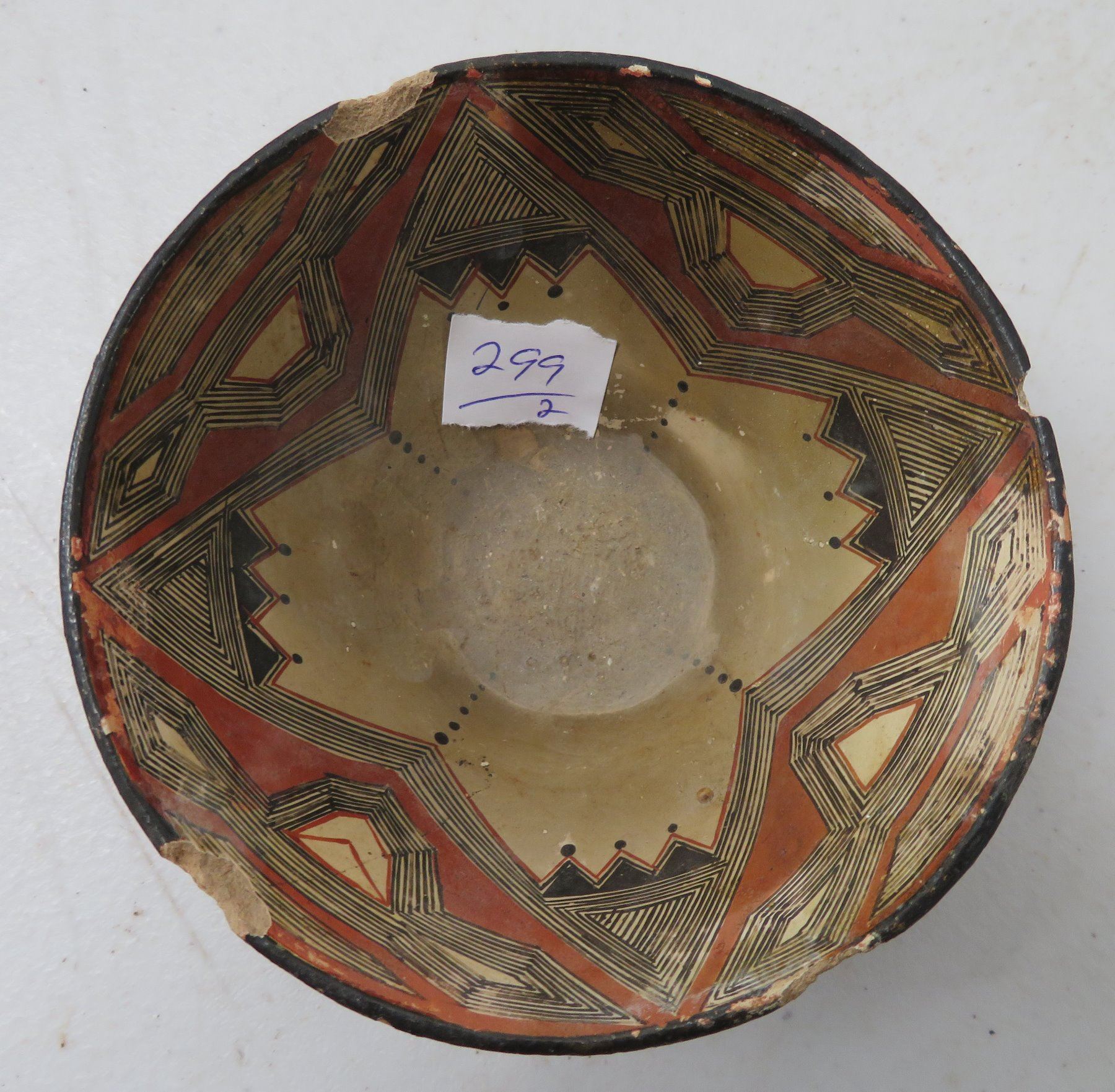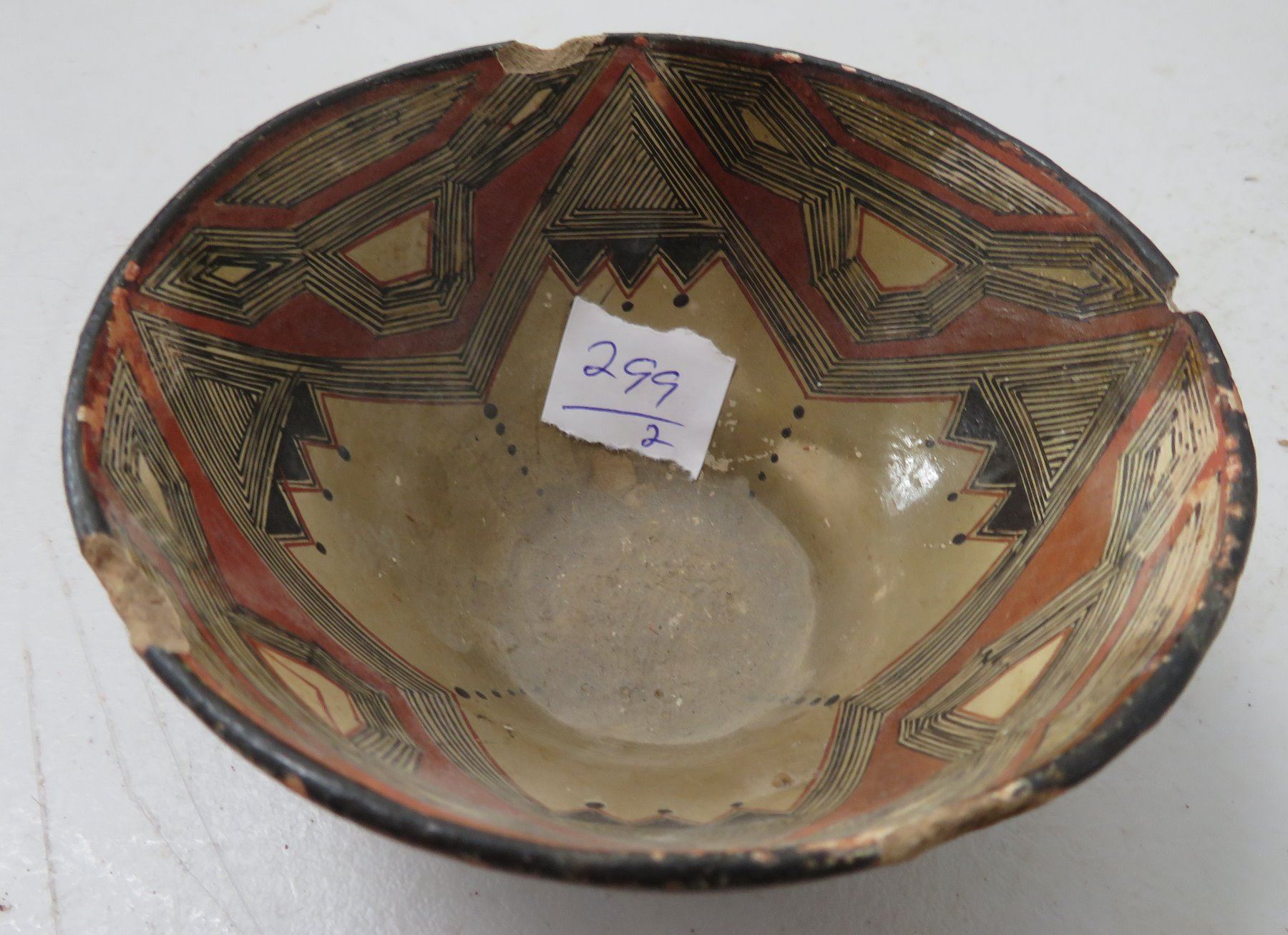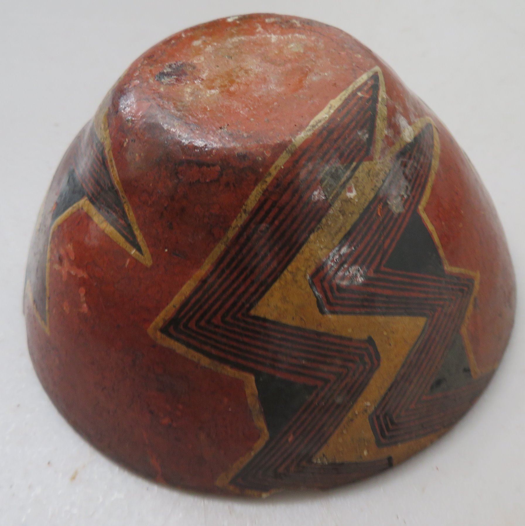 2 Fine Pre-Columbian Bowls, pre-Columbian items. Made of clay and paint, the largest measures 4 1/2". South America. Fine lining on bowl. Condition: Minor chips, see images. Shipping: $26.50 w/insurance and signature.