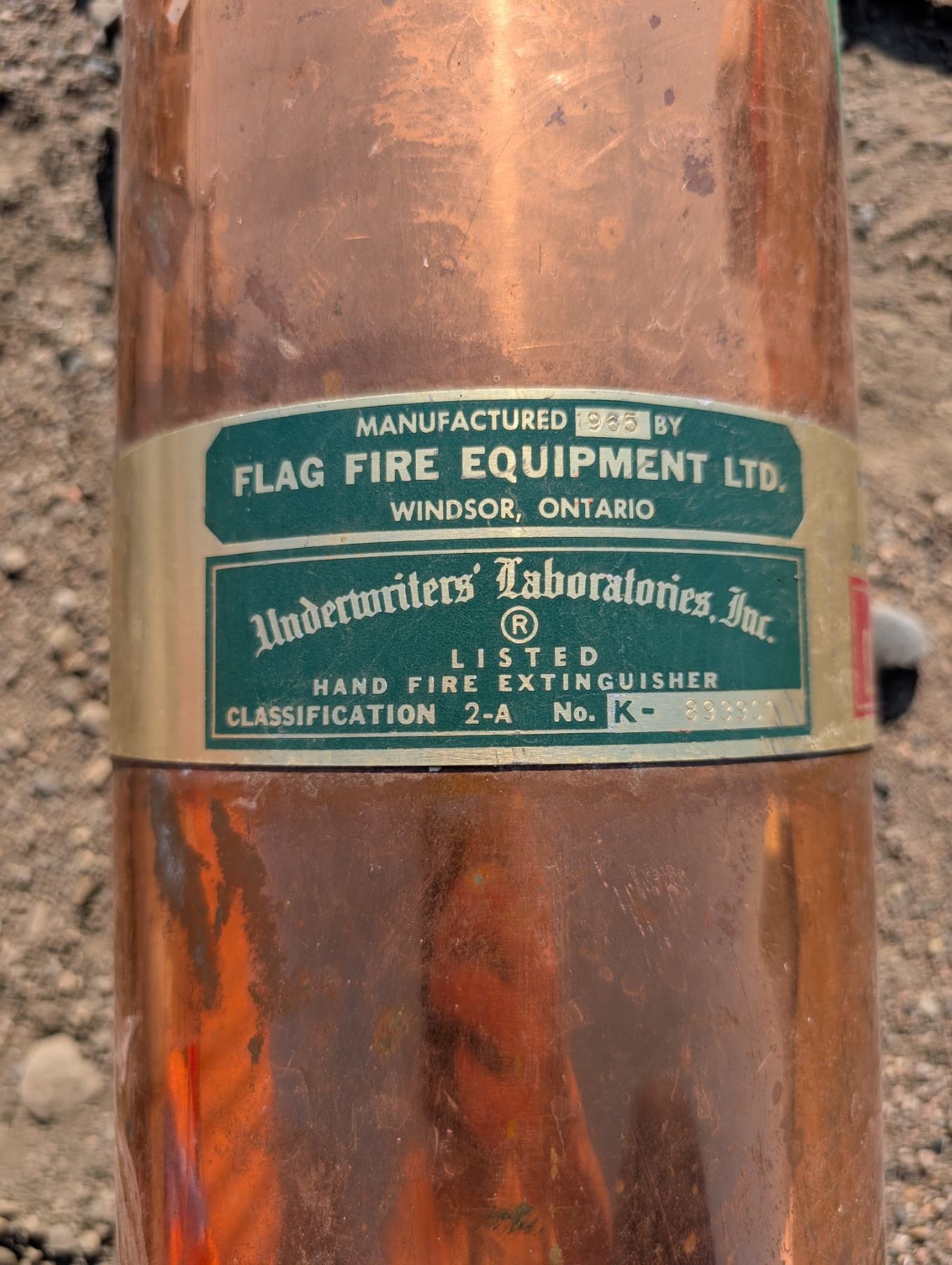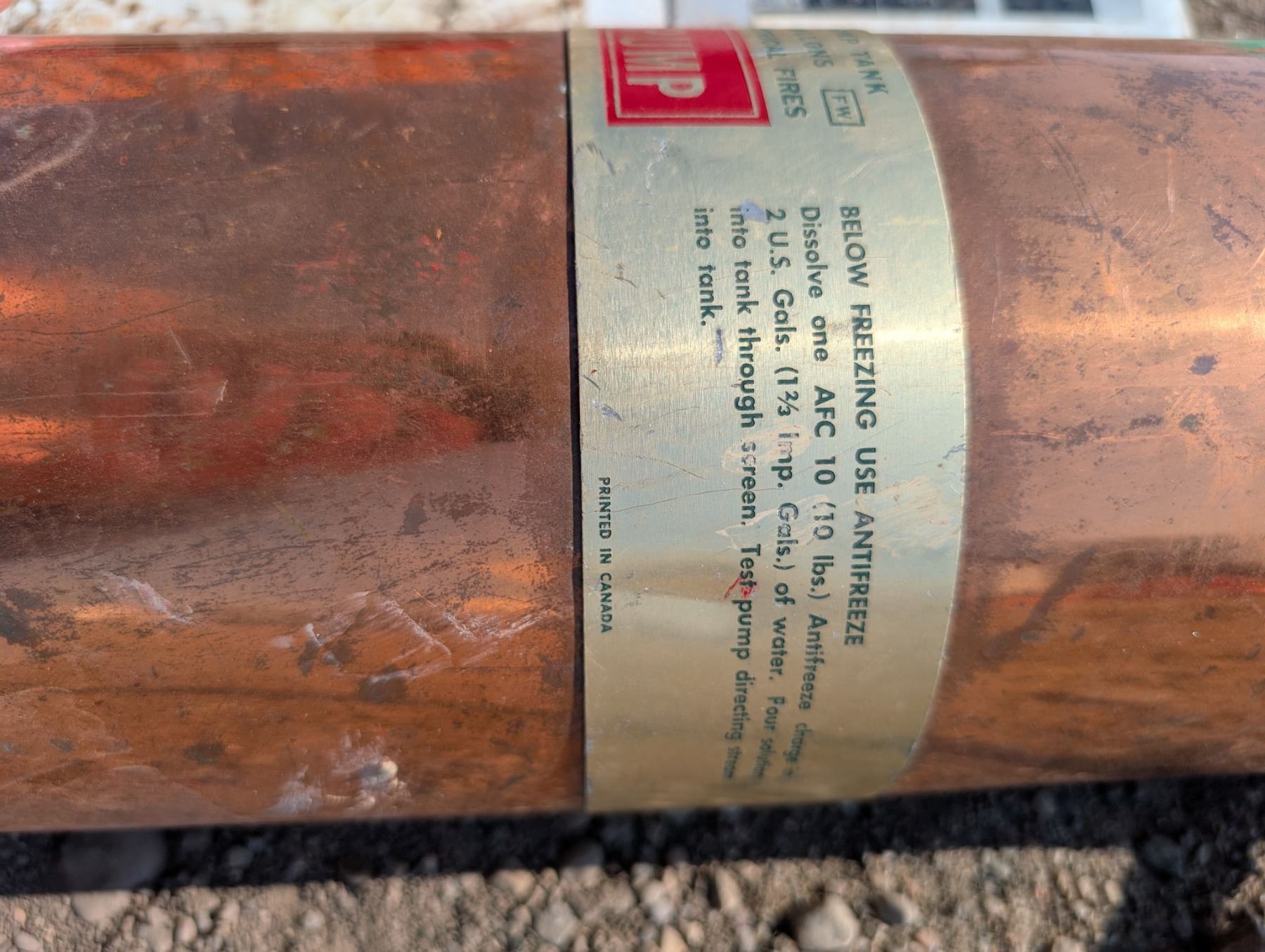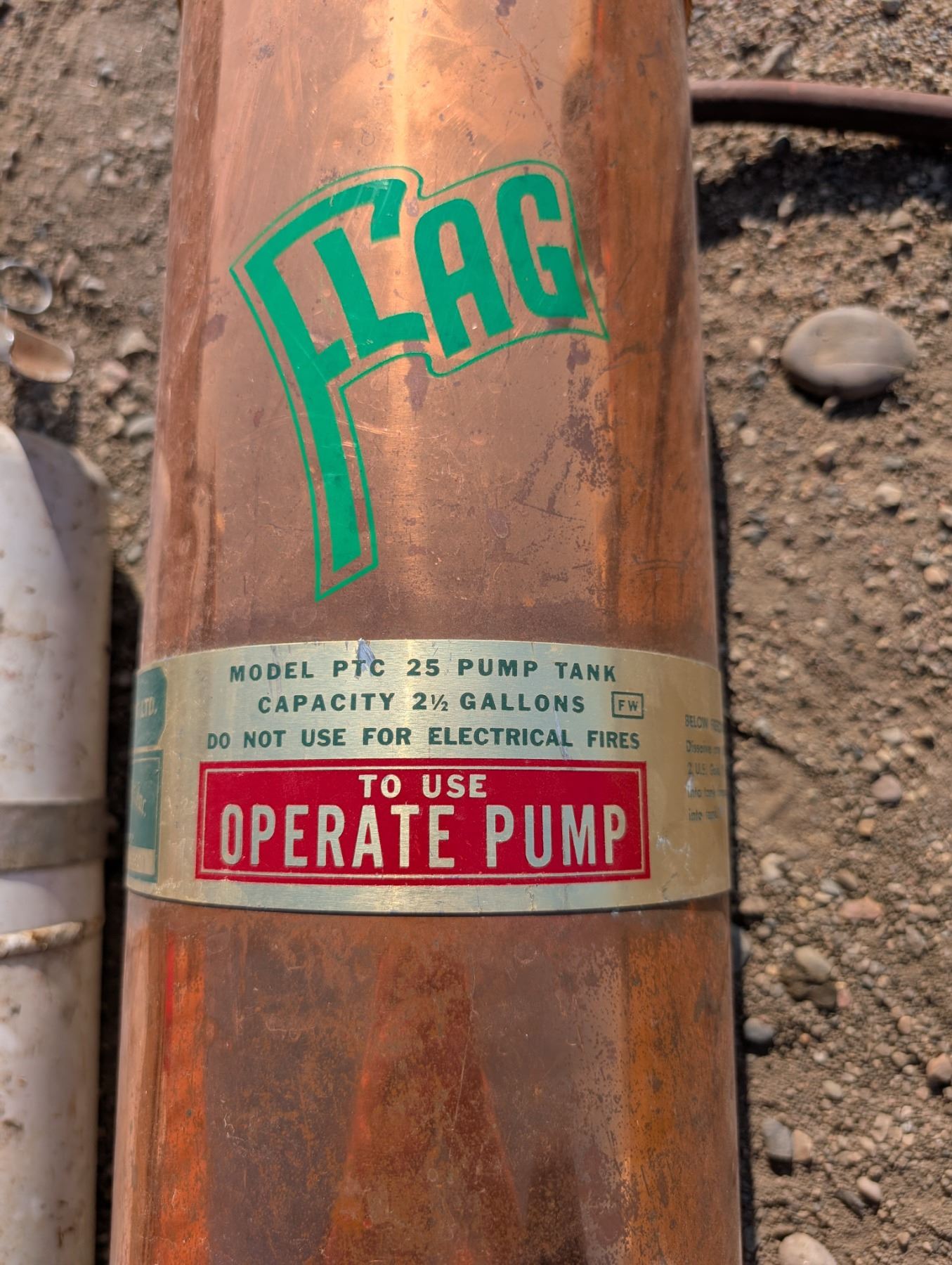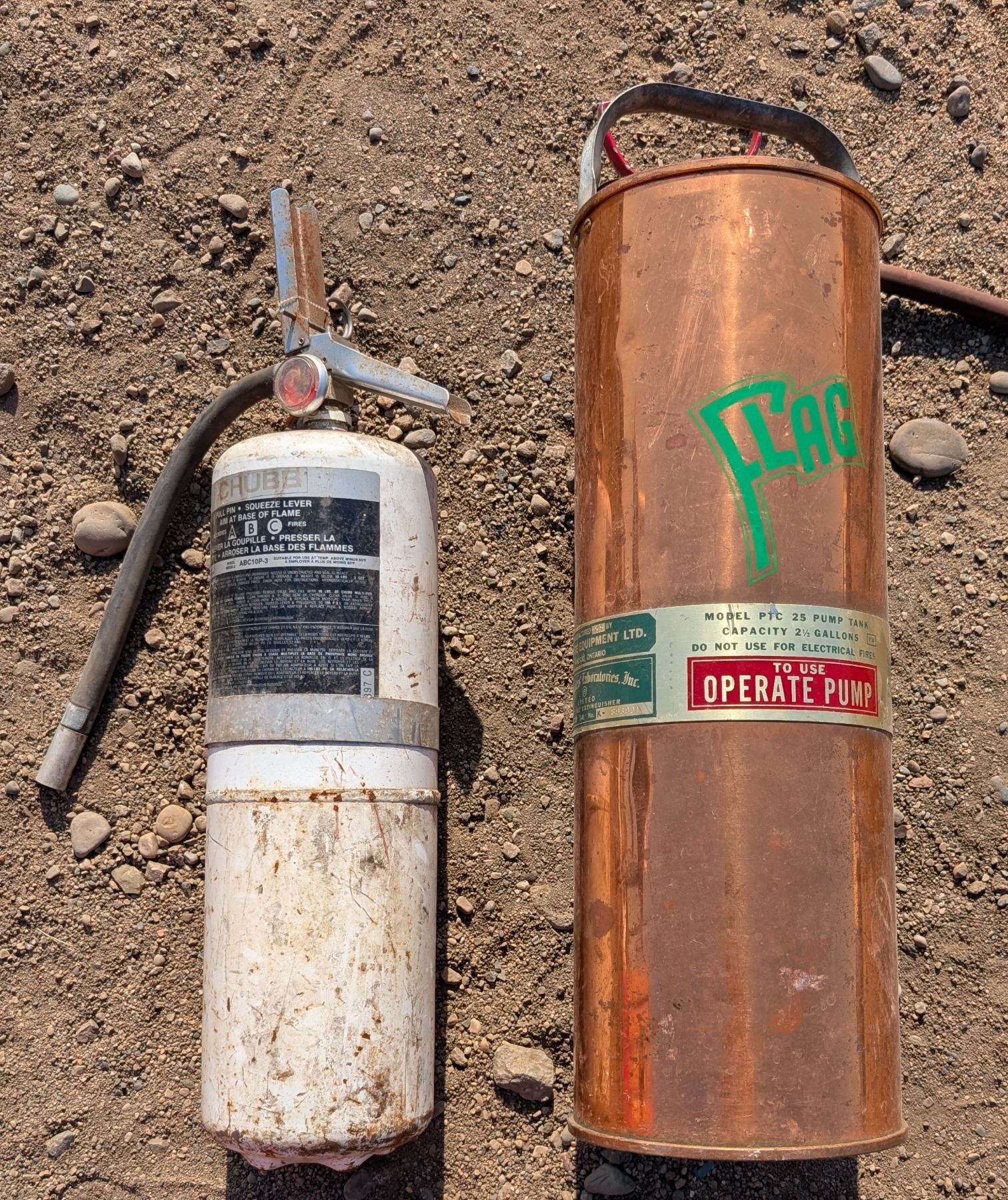 (2) Fire Extinguishers (1) Vintage Copper Flag Fire Equipment LTD. and (1) ABC10P-3 Model Extinguisher