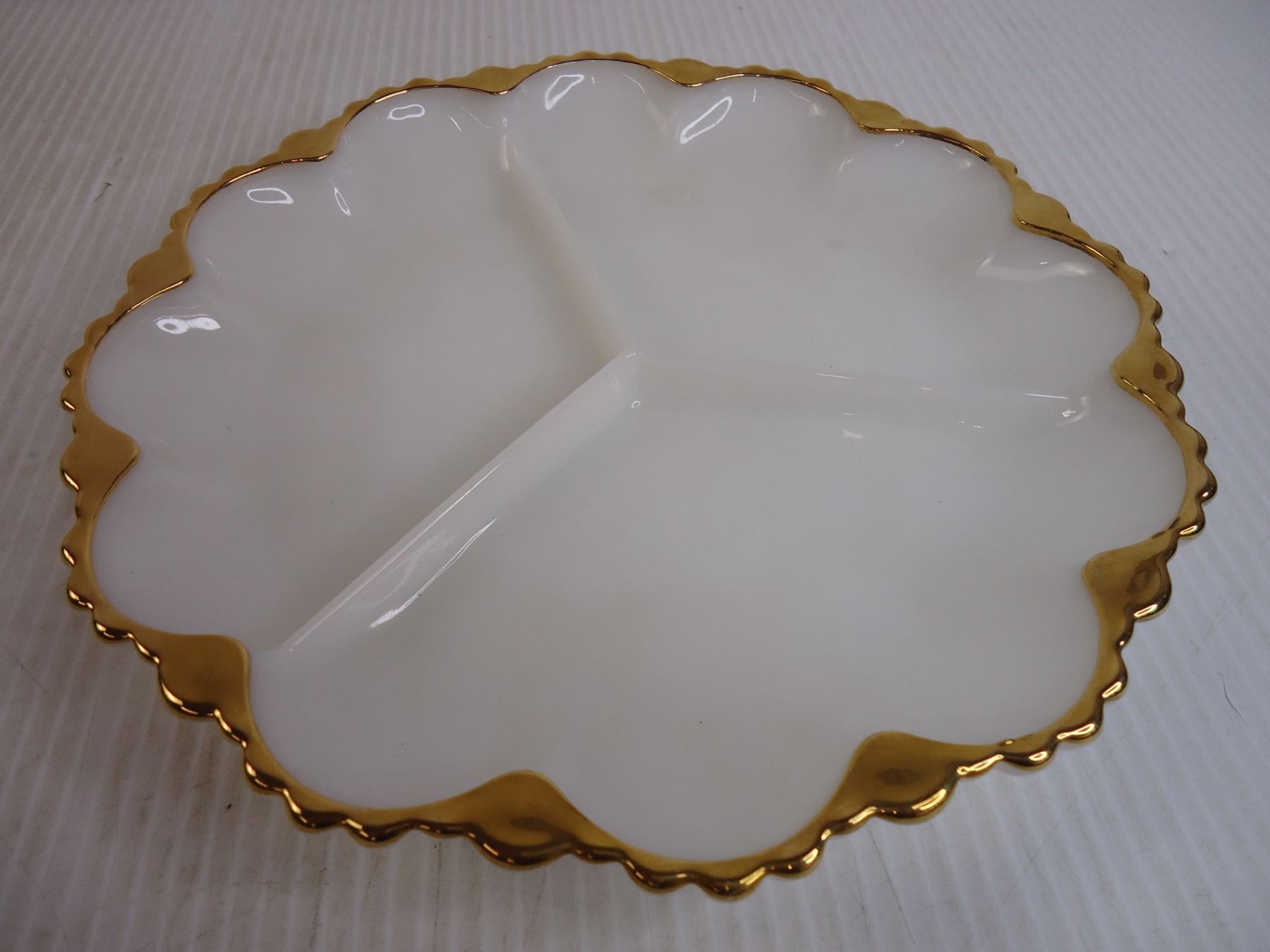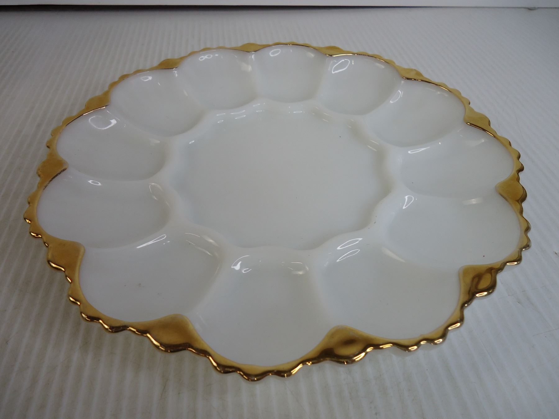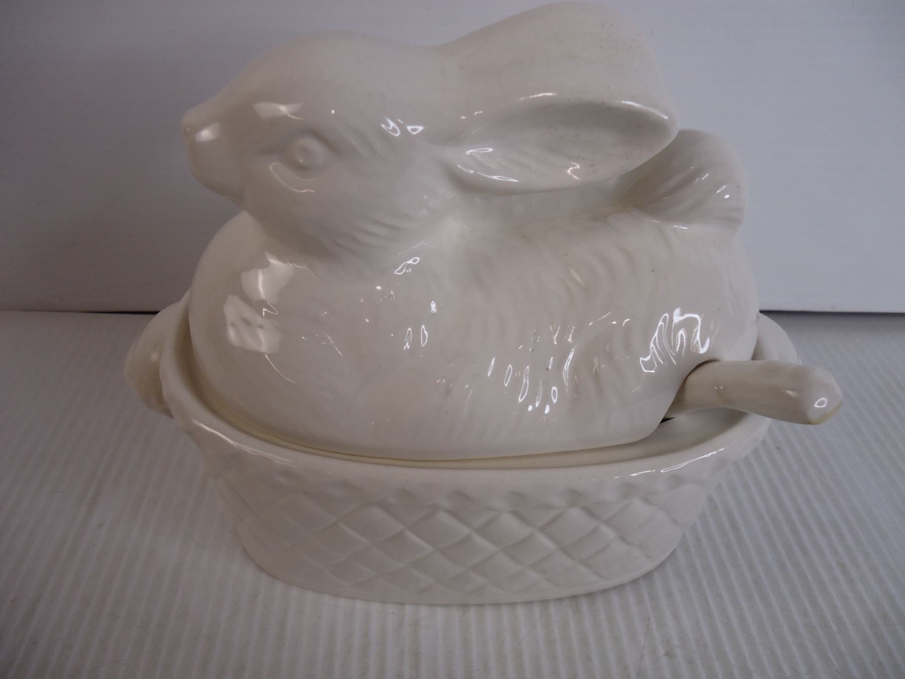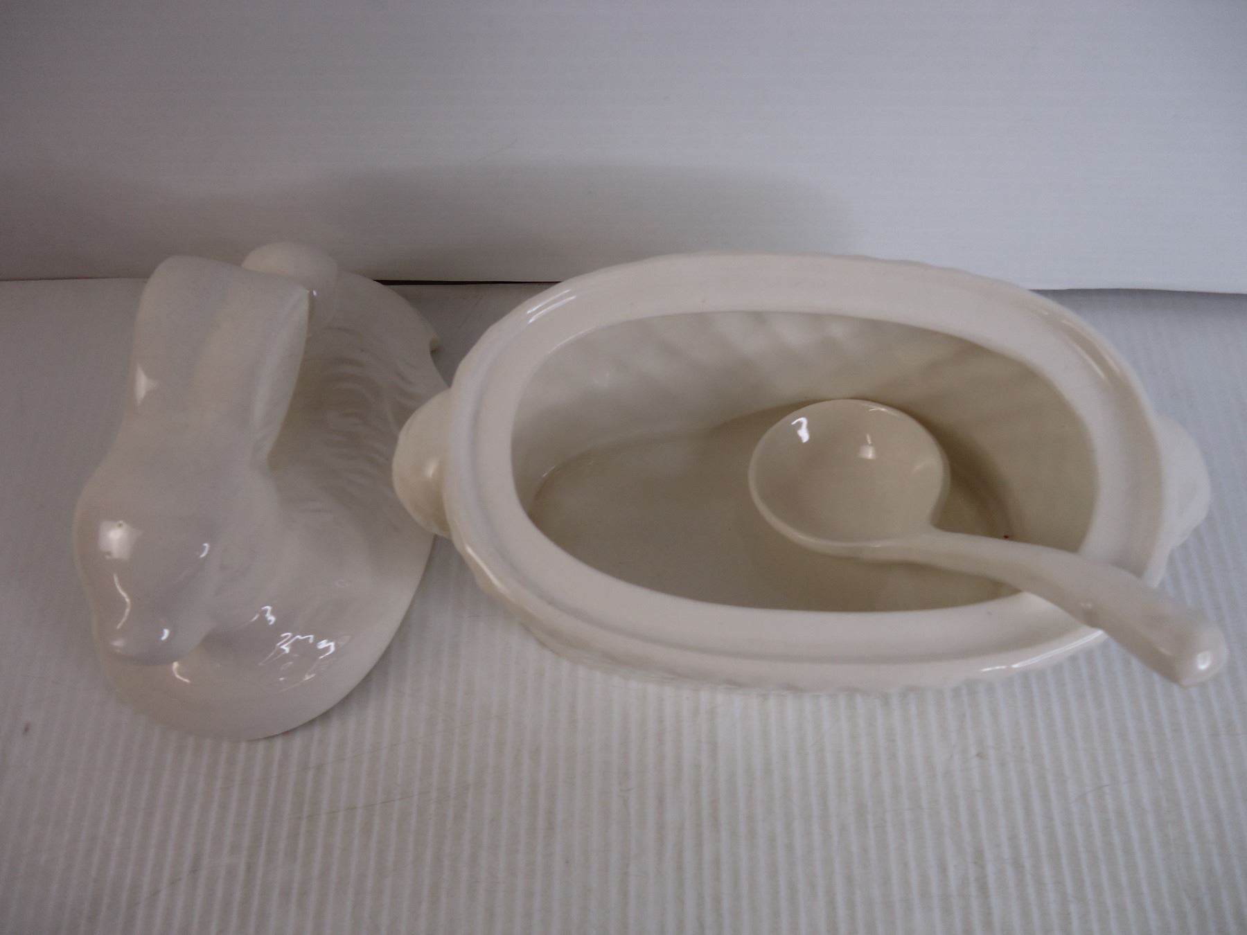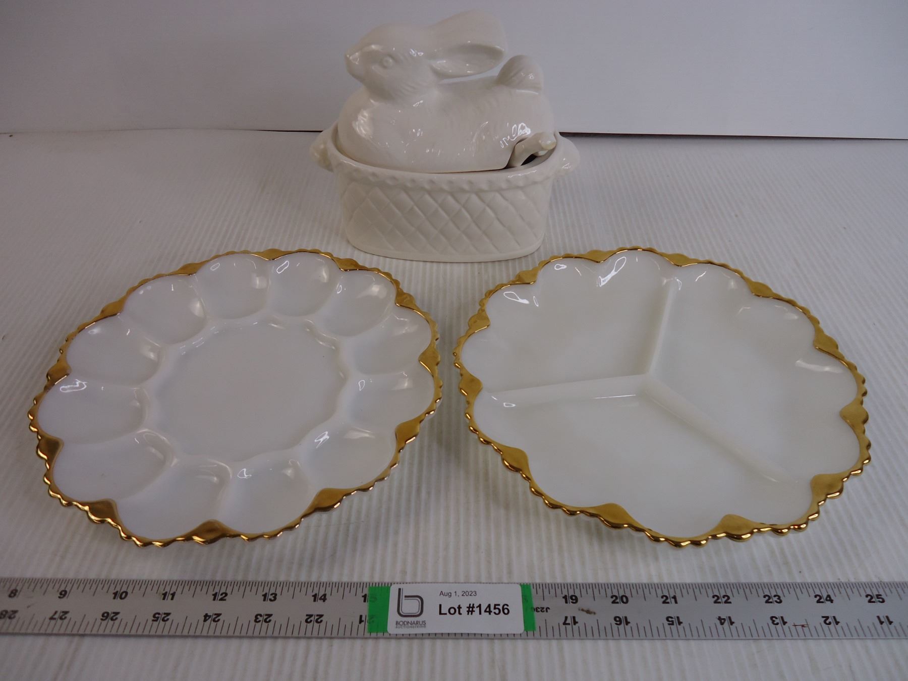 (2) Fire King Milk Glass Serving Trays and (1) Rabbit Tureen and Spoon