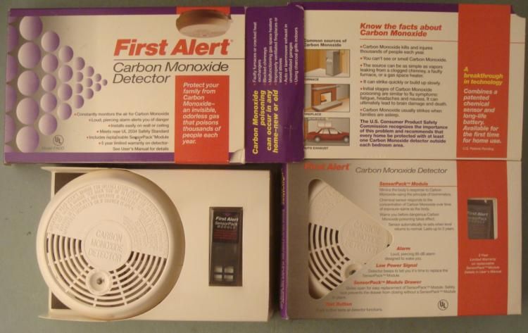 2 First Alert Carbon Monoxide Detector Protector HomeNIB (opened boxes) Constantly monitors the air for Carbon Monoxide Loud, piercing alarm alerts you in danger Installs easily on wall or ceiling Meets new UL 2034 Safety Standard Includes replaceable SensorPack Module 5 year limited warranty on detector- see user manual for detailsProtect your family from a danger you can't see or smell!Carbon Monoxide poisoning can occur in any home -new or oldFaulty furnaces or cracked heat exchangersBlocked chimneysMalfunctioning has space heatersImproperly ventilated fireplaces or wood stovesAuto or lawnmower exhaust in unventiilated garagesUsing charcoal grills indoors