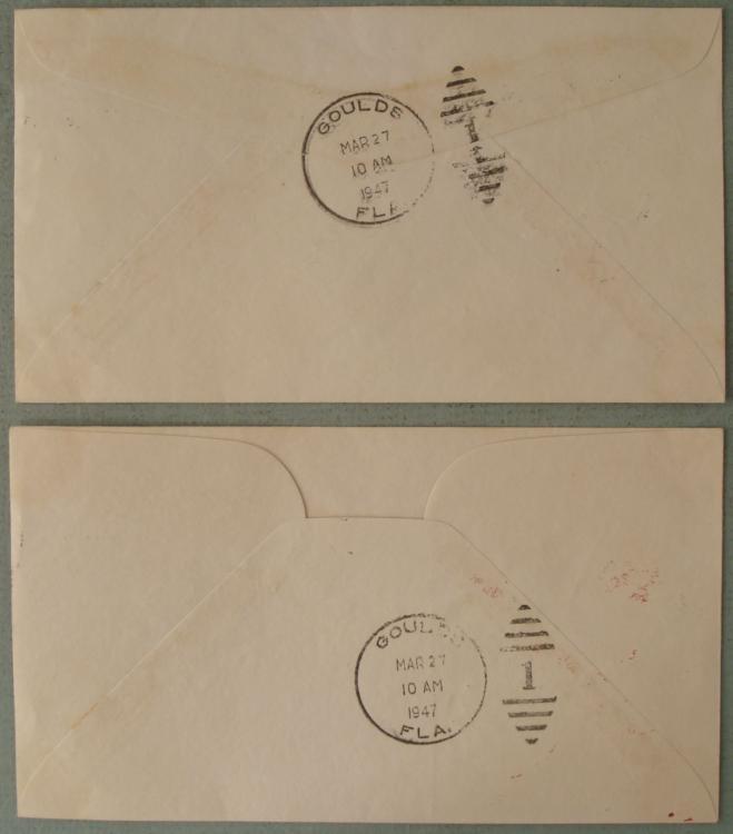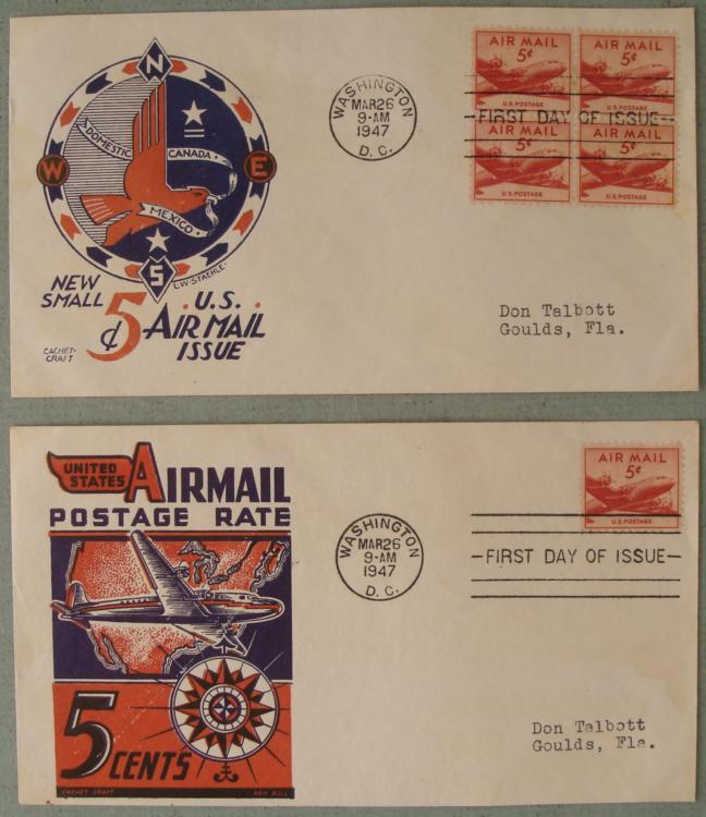 Here are two Air Mail First Day Covers, both with bold red and blue graphics on the envelopes. They have identical post marks from Washington dated 1947, and 5 stamps altogether. They are in very good condition. * Add these to your air mail or covers collection.