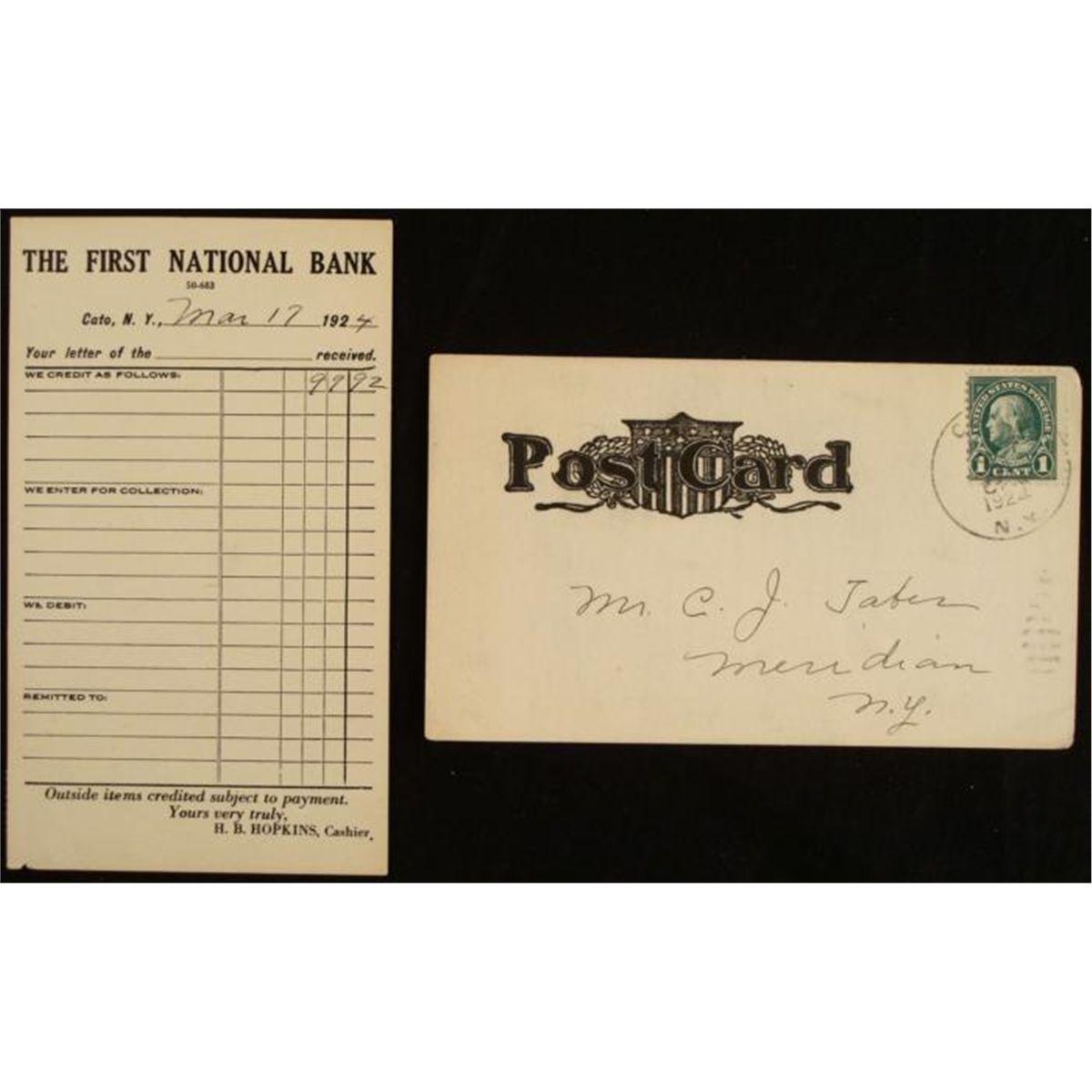 These are two official First National Bank Post Cards. They are addressed to C. J. Tabor, Meridian, New York, and post marked 1924. The amounts and dates are hand written on back. The cashiers name printed on back is H.B. Hopkins. All are in plastic sleeves, and in very good condition overall. *