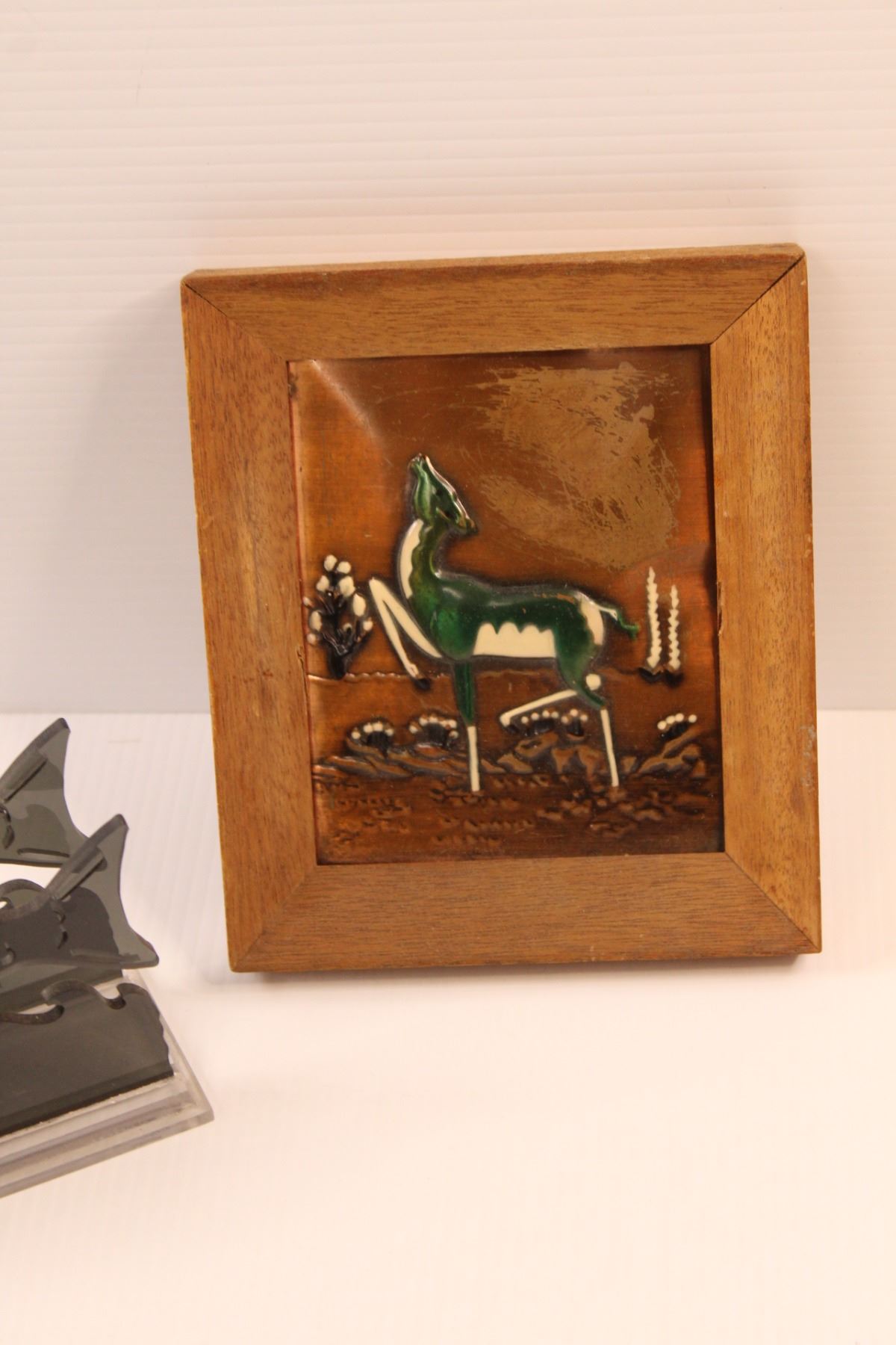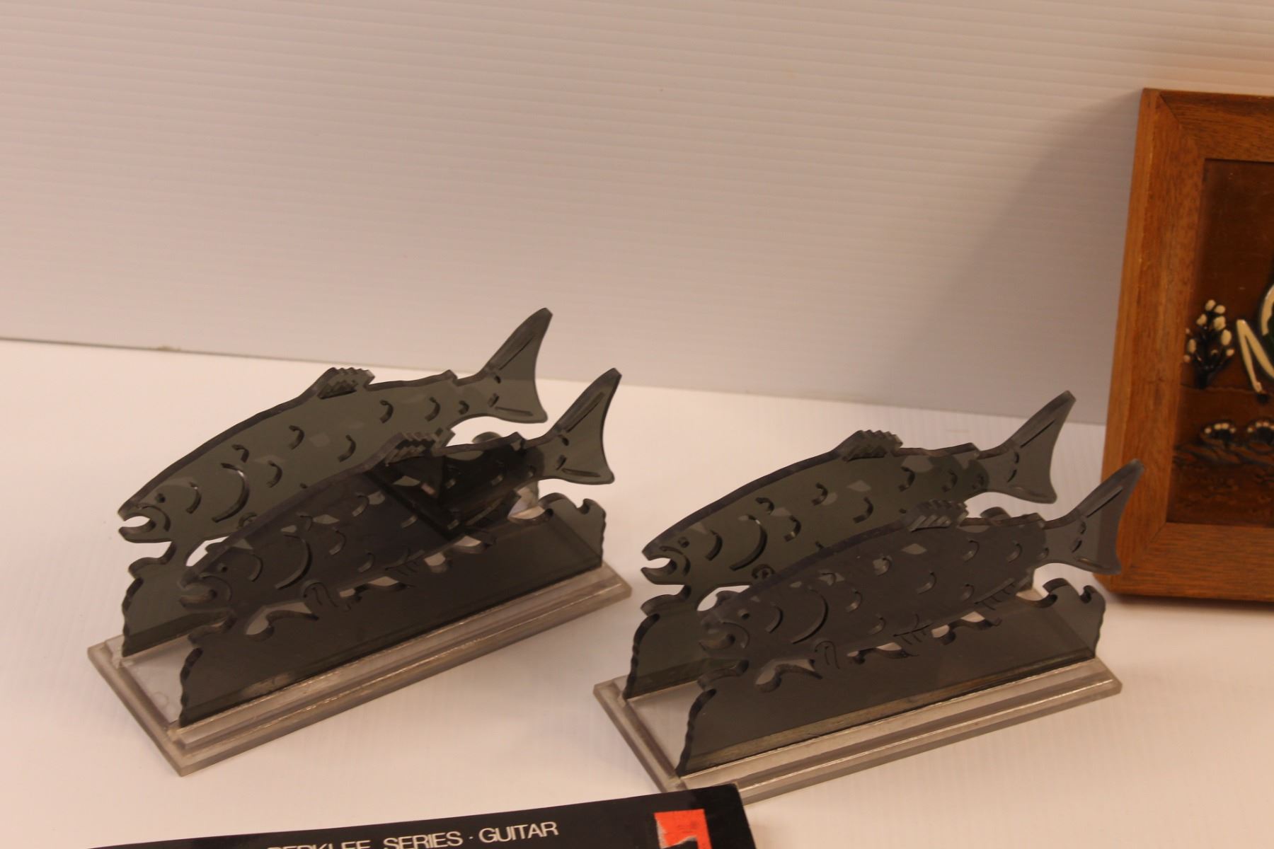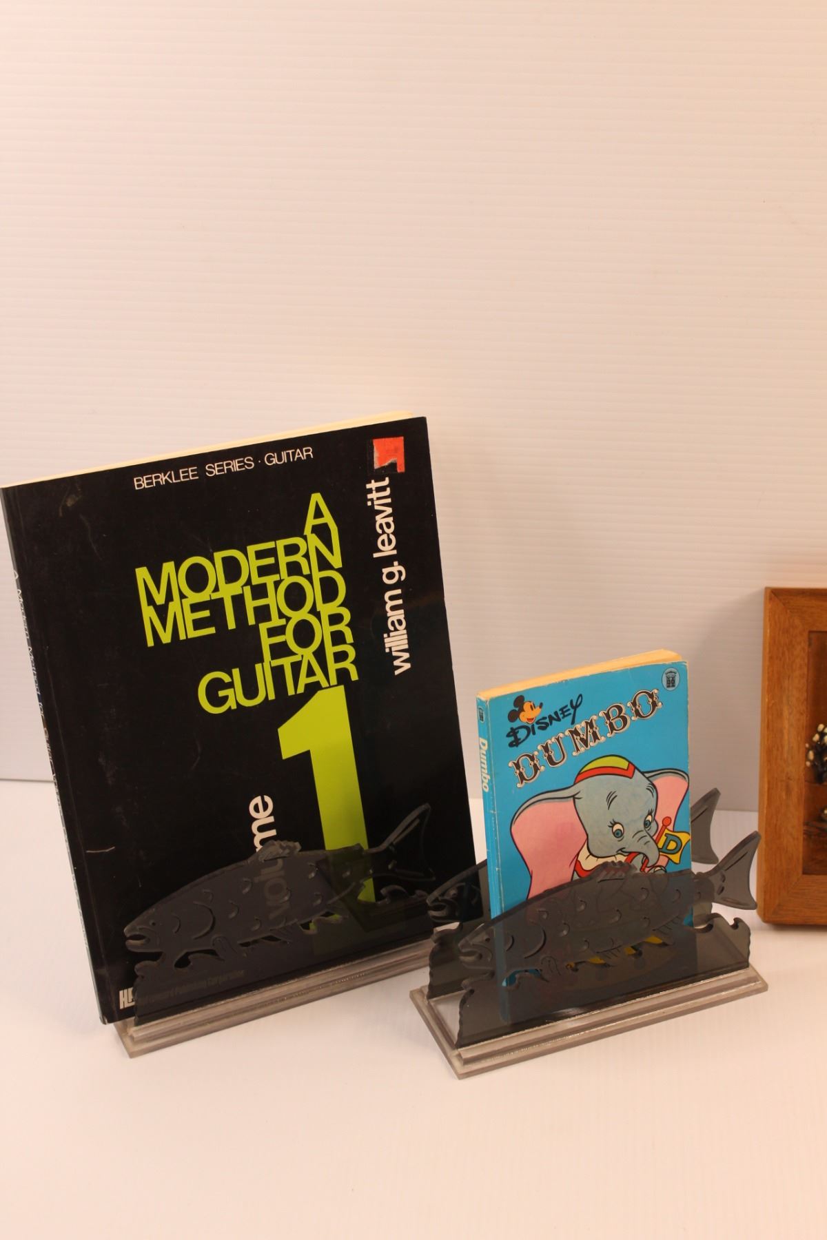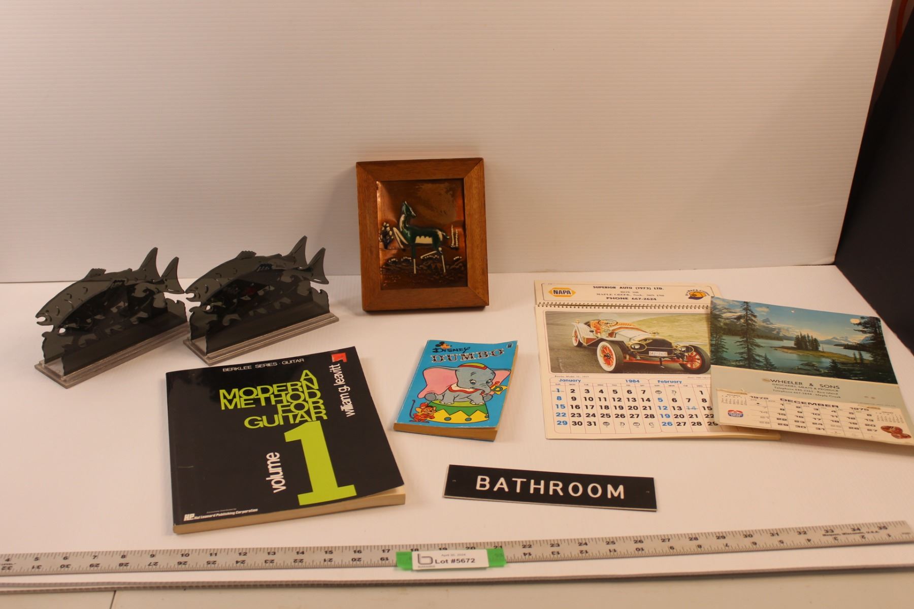(2) Fish Holders (For Books or Files), Small (6"x8") Framed Copper Deer, (2) Vintage Calendars (1975, 1984), Disney Dumbo and Guitar Books & Bathroom Sign