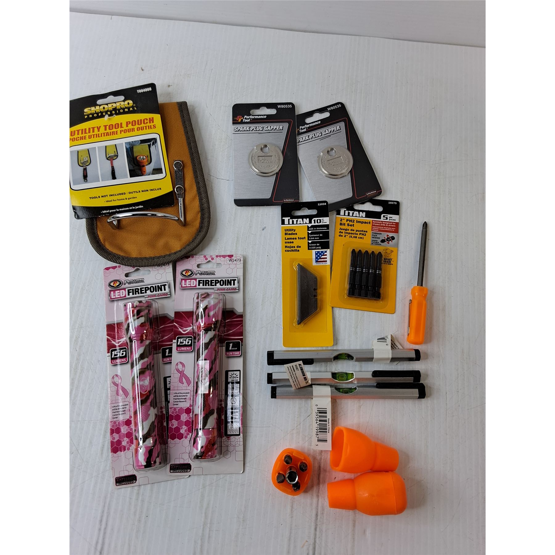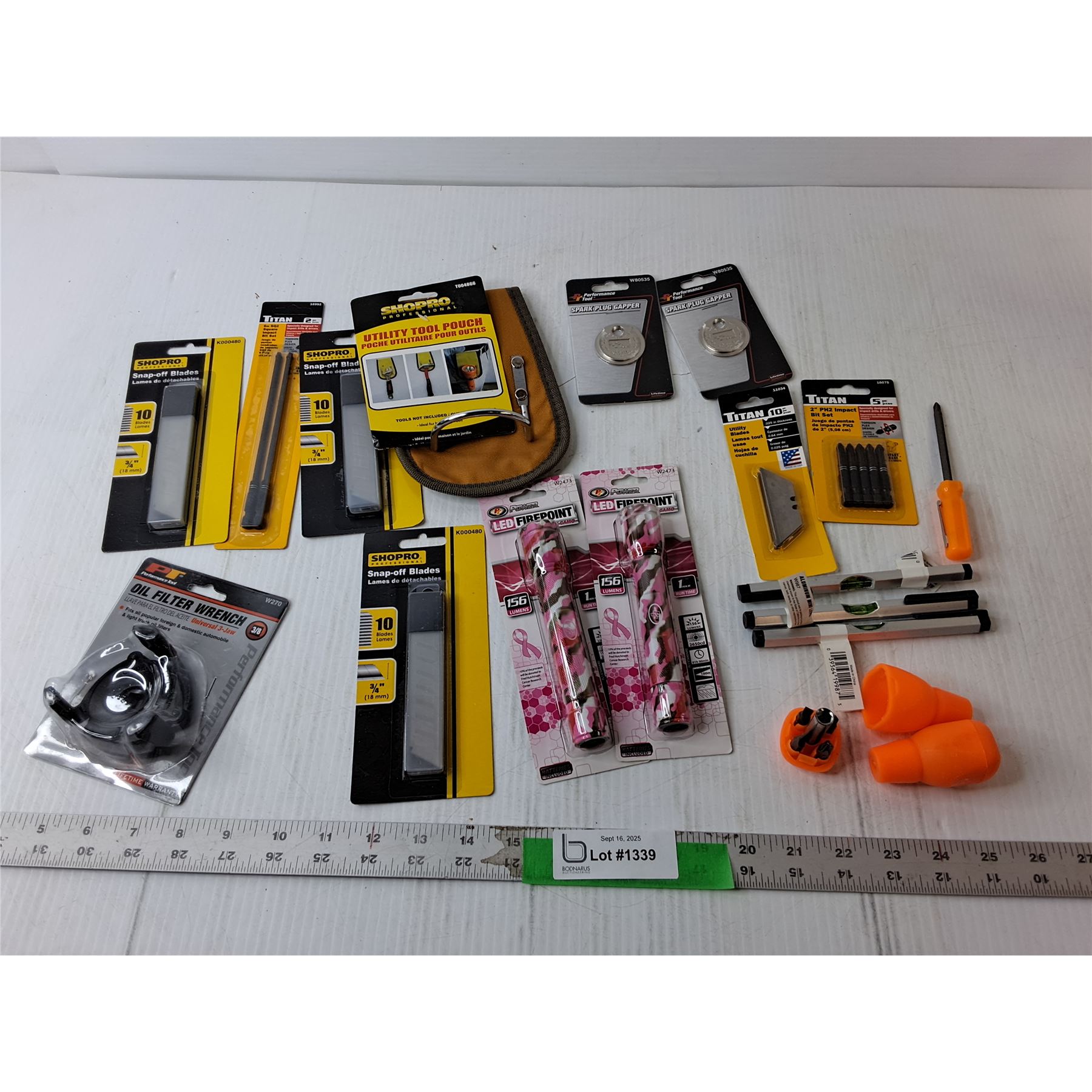 (2) Flashlights, Oil Filter Wrench, Impact Bit Set- Sealed, Misc.