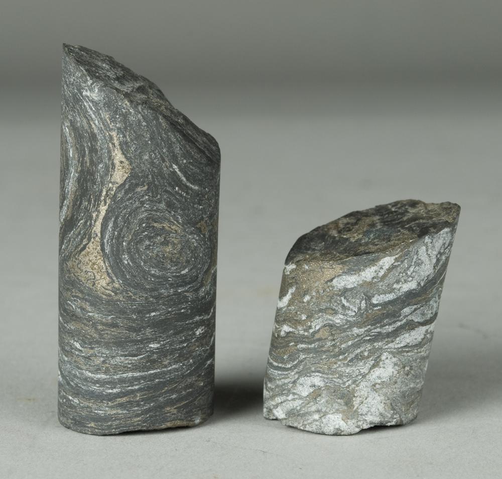 Both cylindrical with flat end and angled top. Largest mainly black with gold and white striations throughout, 2.5" L. Smallest gray with white, gold and black striations throughout, 1.5" L.