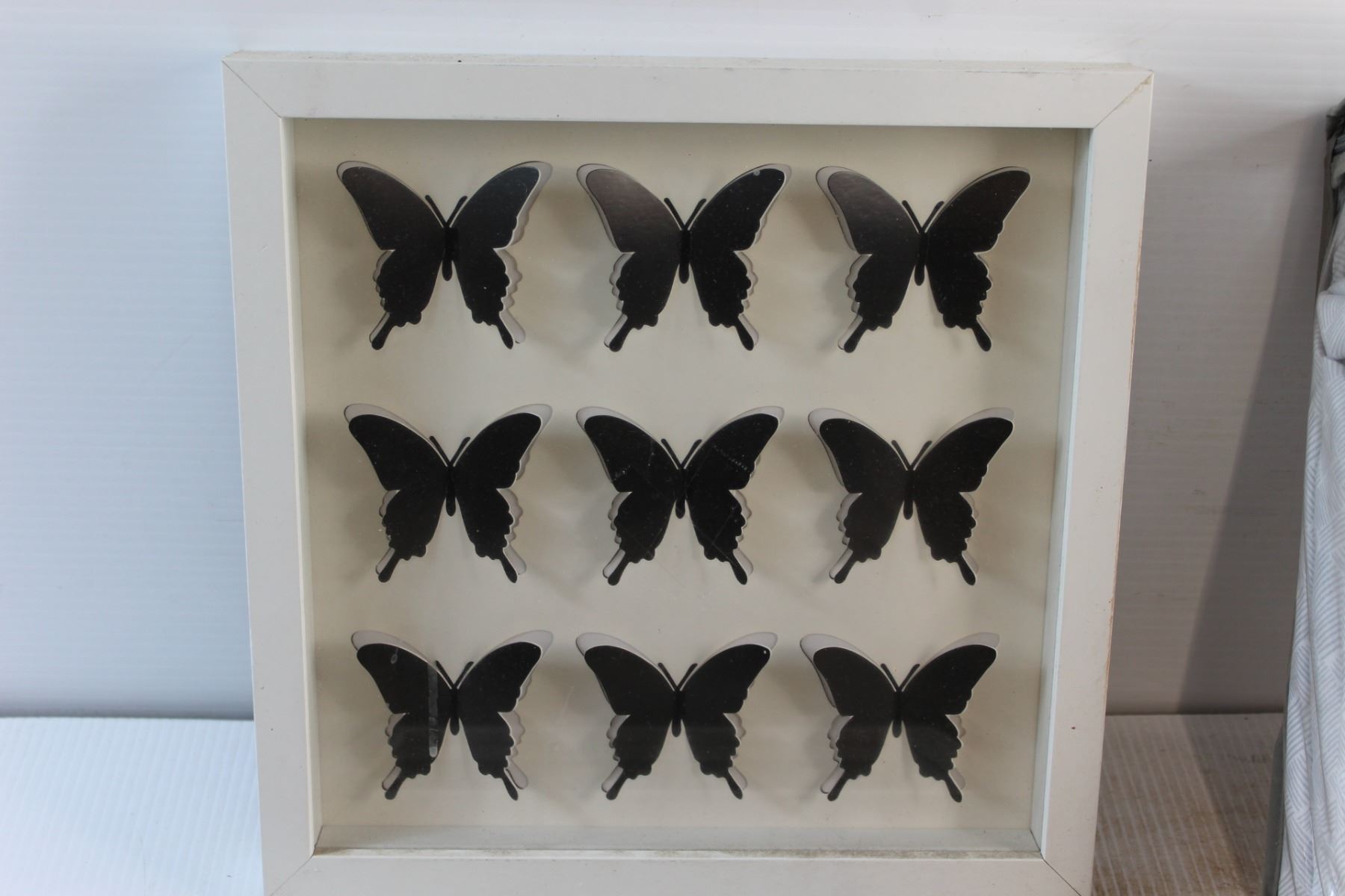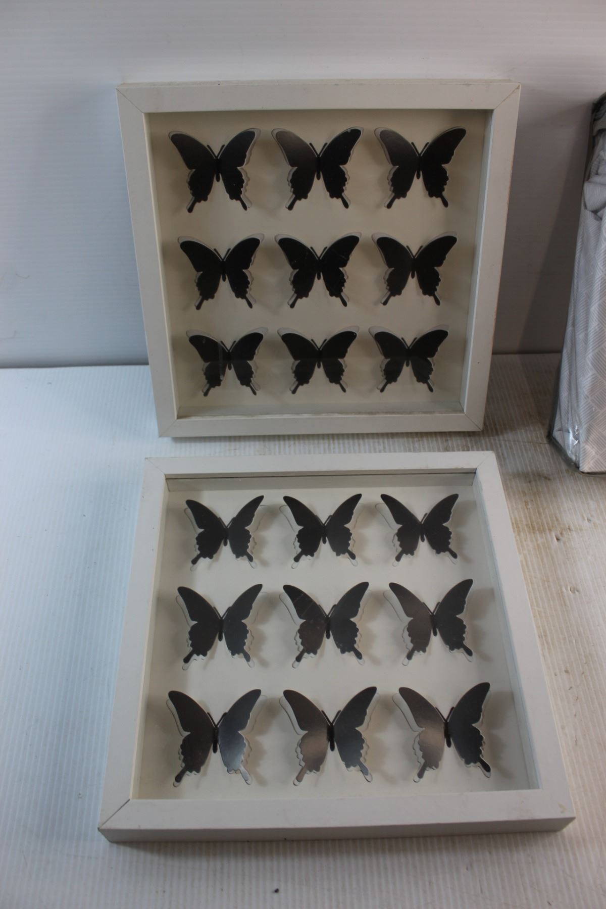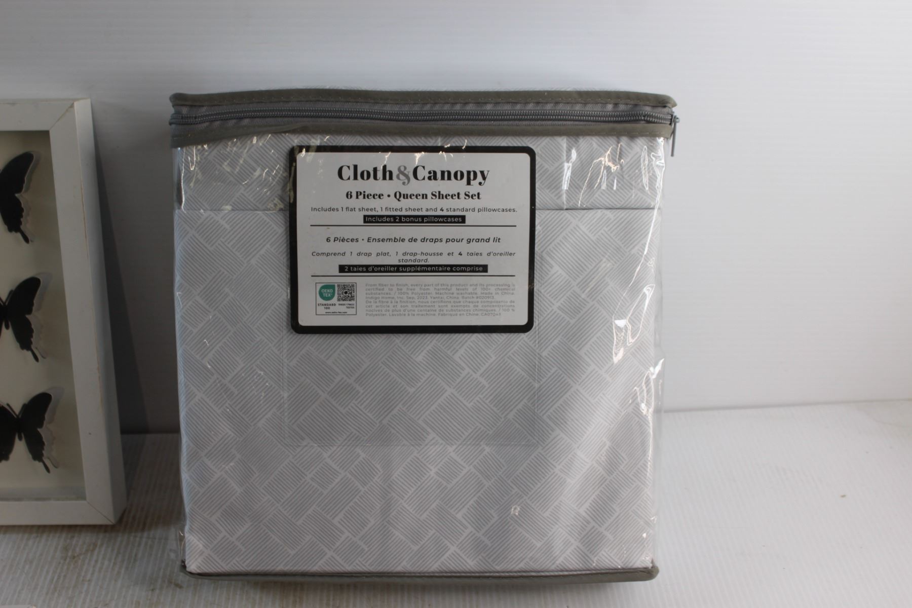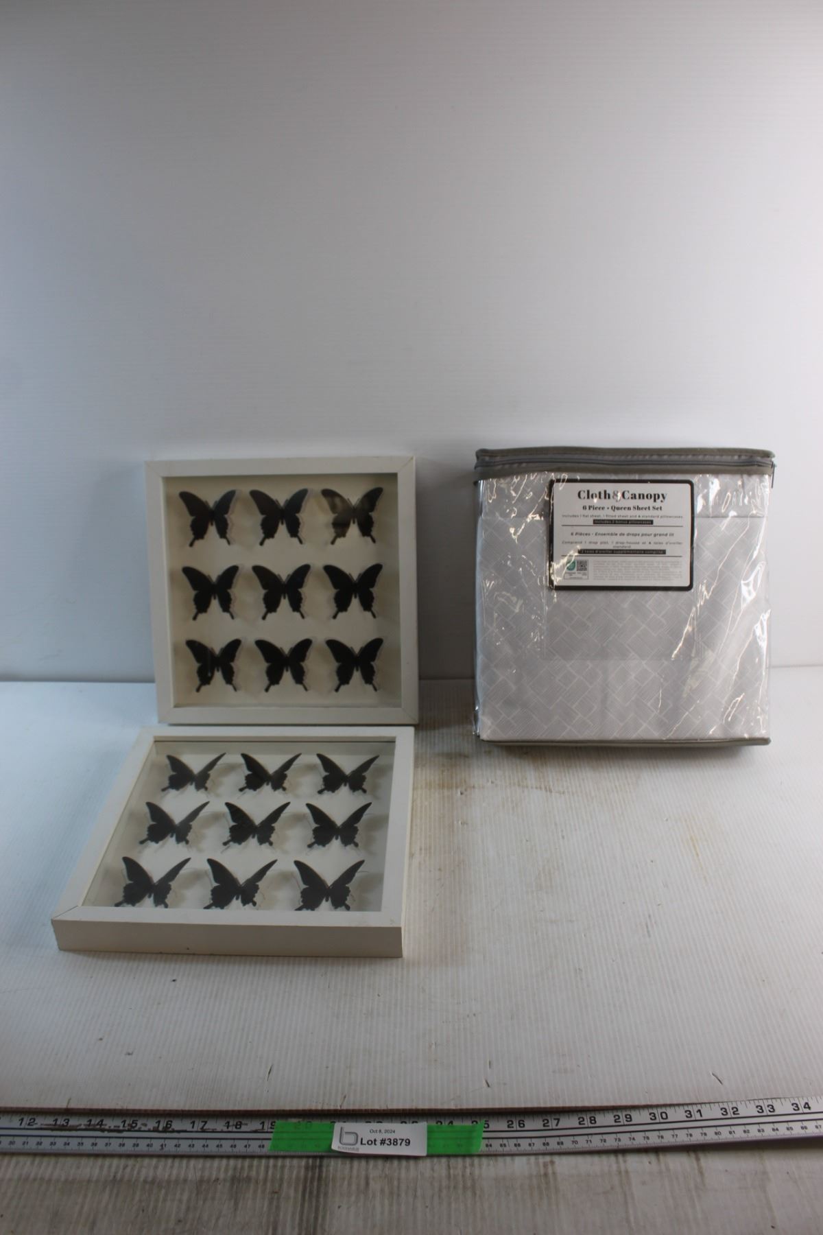 (2) Framed Butterfly Wall Decorations and Cloth&Conopy 6pc Queen Sheet Set