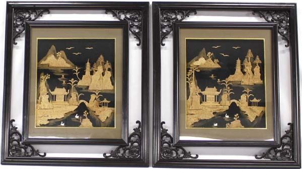 2 Framed Chinese Carved Cork Landscape Pictures, under glass, beautifully framed, very intricate details, visual measures 9.5'' x 10.75'', overall measurement of 20'' x 18'', well executed with remarkable details