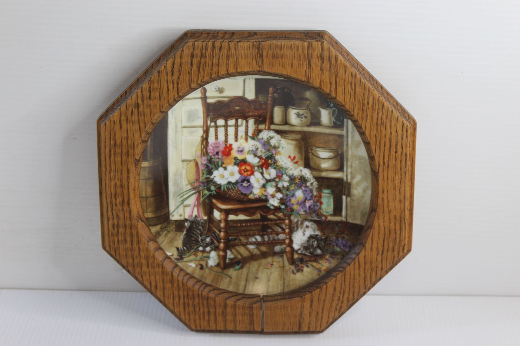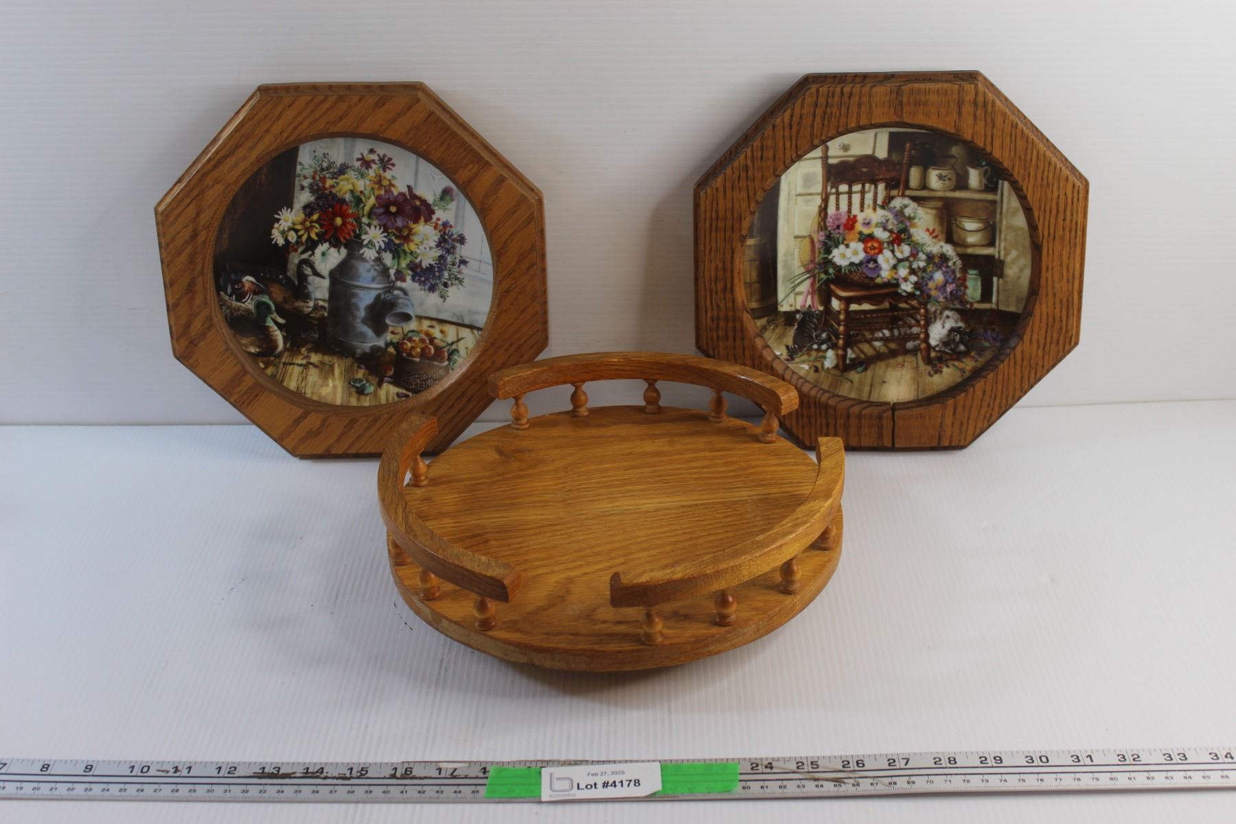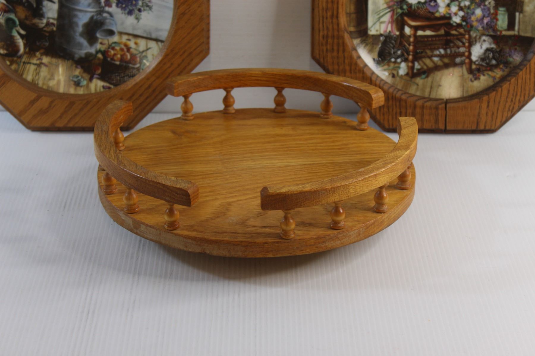 (2) Framed Decorative Wall Hanging Plates - Some Damage and Wooden Lazy Susan