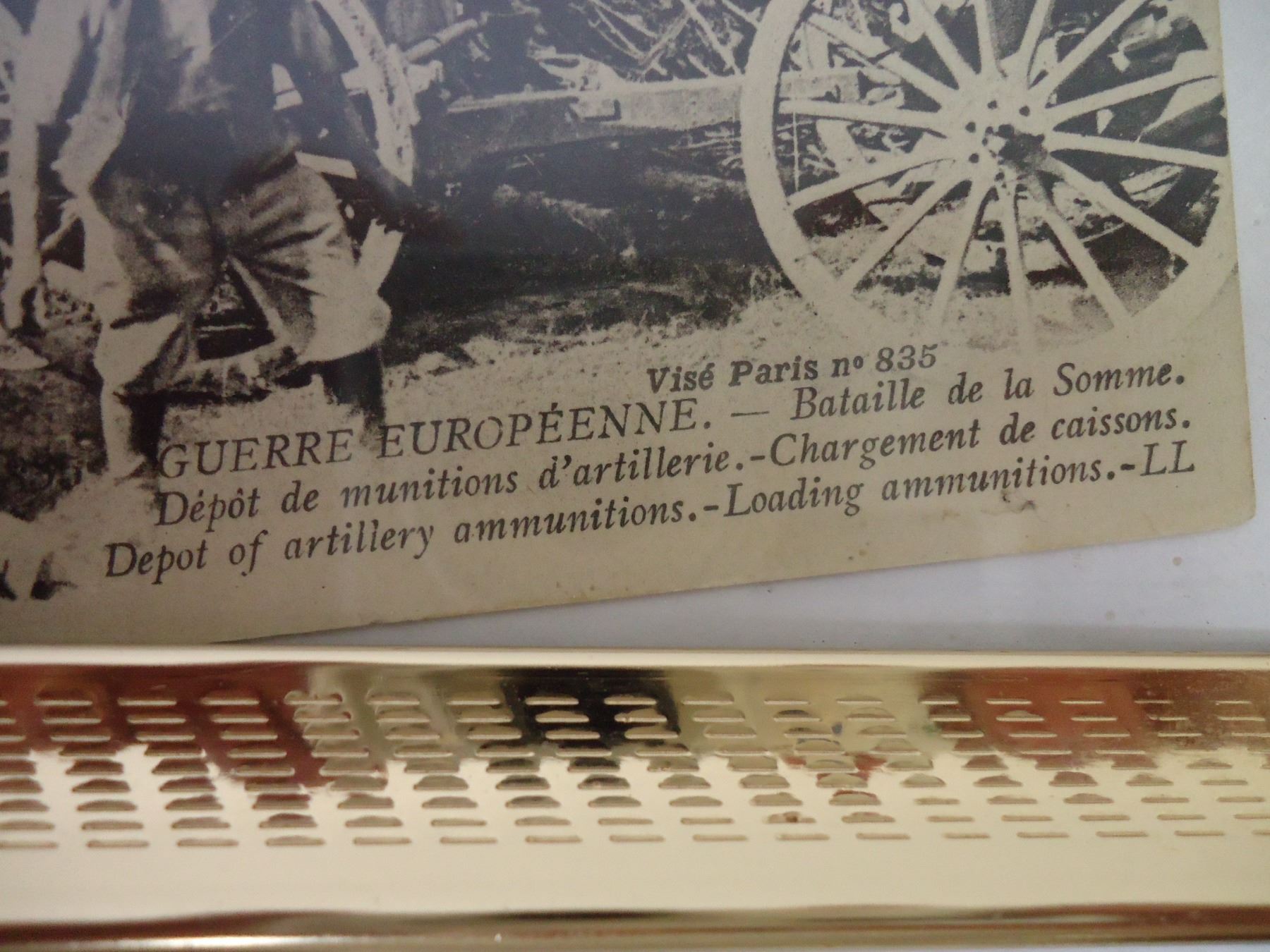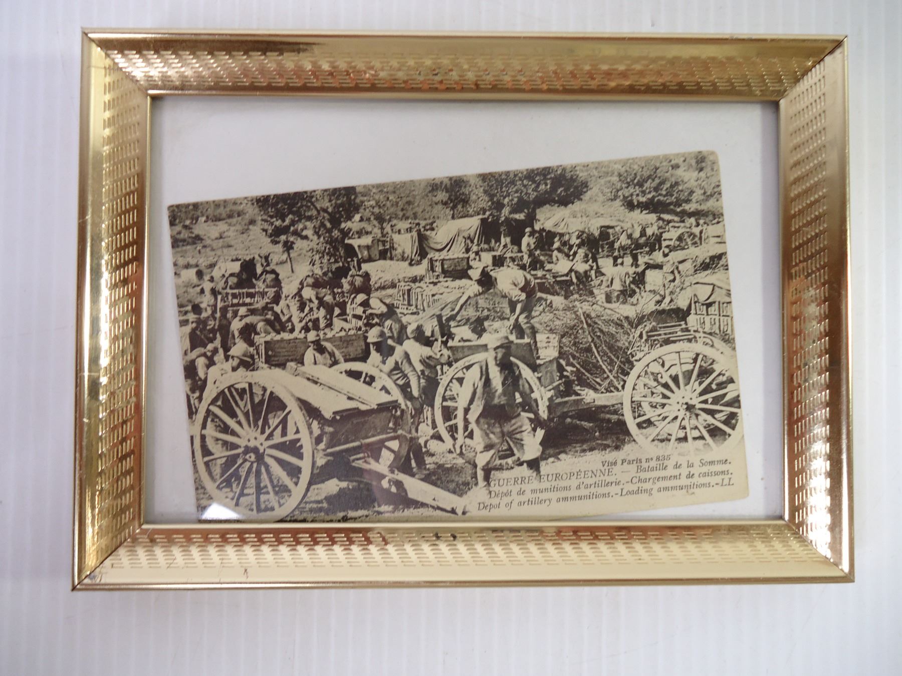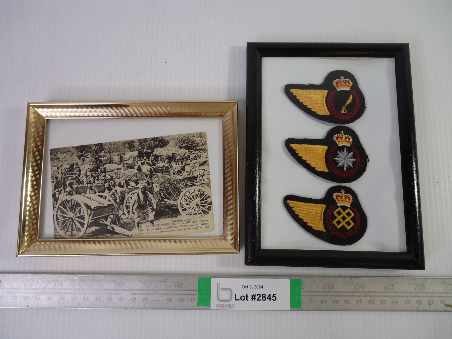 (2) Framed Items-French Postcard from of Artillery from the Battle of the Somme and 3 Trades Patches from Canadian Forces