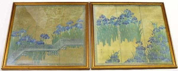 2 Framed Japanese Screen Panel Prints ''Irises at Yatsuhashi'' (Eight Bridges) by Ogata Korin, each frame has 3 panels, overall framed measurement of 31'' x 32'', visual measures 28'' x 29.5'', gold gilt wood frames and under glass, signed on first panel by artist. FYI: ''Ogata Korin (Japanese (1658-1716) was a Japanese painter, lacquerer and designer of the Rinpa School. Korin is best known for his byobu folding screens, such as Irises and Red and White Plum Blossoms, and his paintings on ceramics and lacquerware produced by his brother Kenzan (1663-1743). Also a prolific designer, he worked with a variety of decorative and practical objects, such as round fans, makie writing boxes or inro medicine cases. He is also credited with reviving and consolidating the Rinpa school of Japanese painting.''