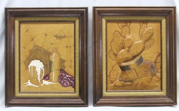 2 Framed Leather Pictures By Troy Anderson. Framed in wood frames. Visual measures approx. 14'' x 10 1/2''. Buyers Pay Actual Shipping and Handling Charges(see terms and conditions for more information).