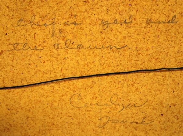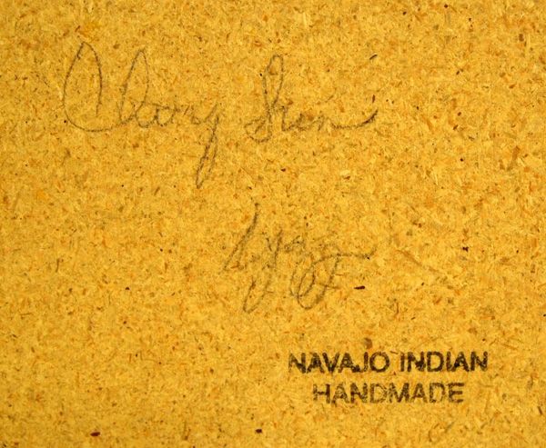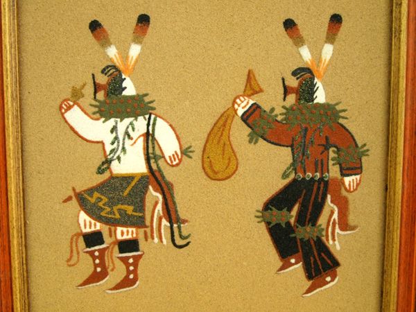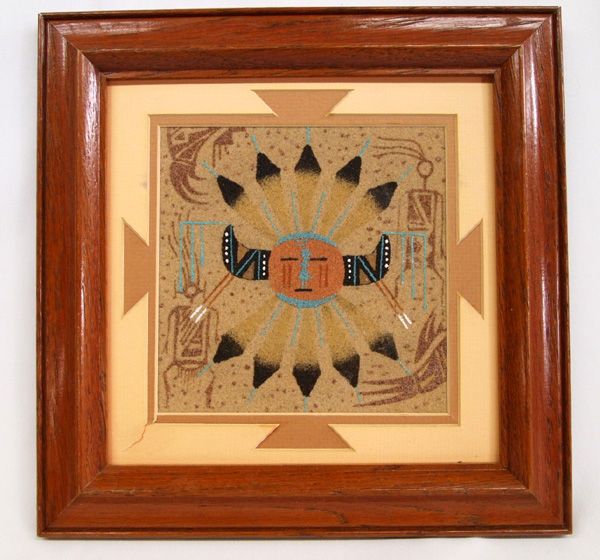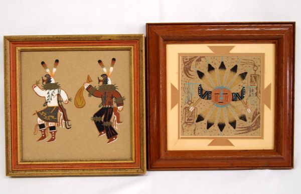 2 Framed Navajo Sand Paintings. One sand painting is of the ''Chiricahua Sun'' and is signed on the back. It has a tear in the outside mat. The other sand painting is of two figures, ''Yei'' and ''Clown''. It is signed on the back by the artist, Carolyn Tsosie. This sand painting is 7'' square.