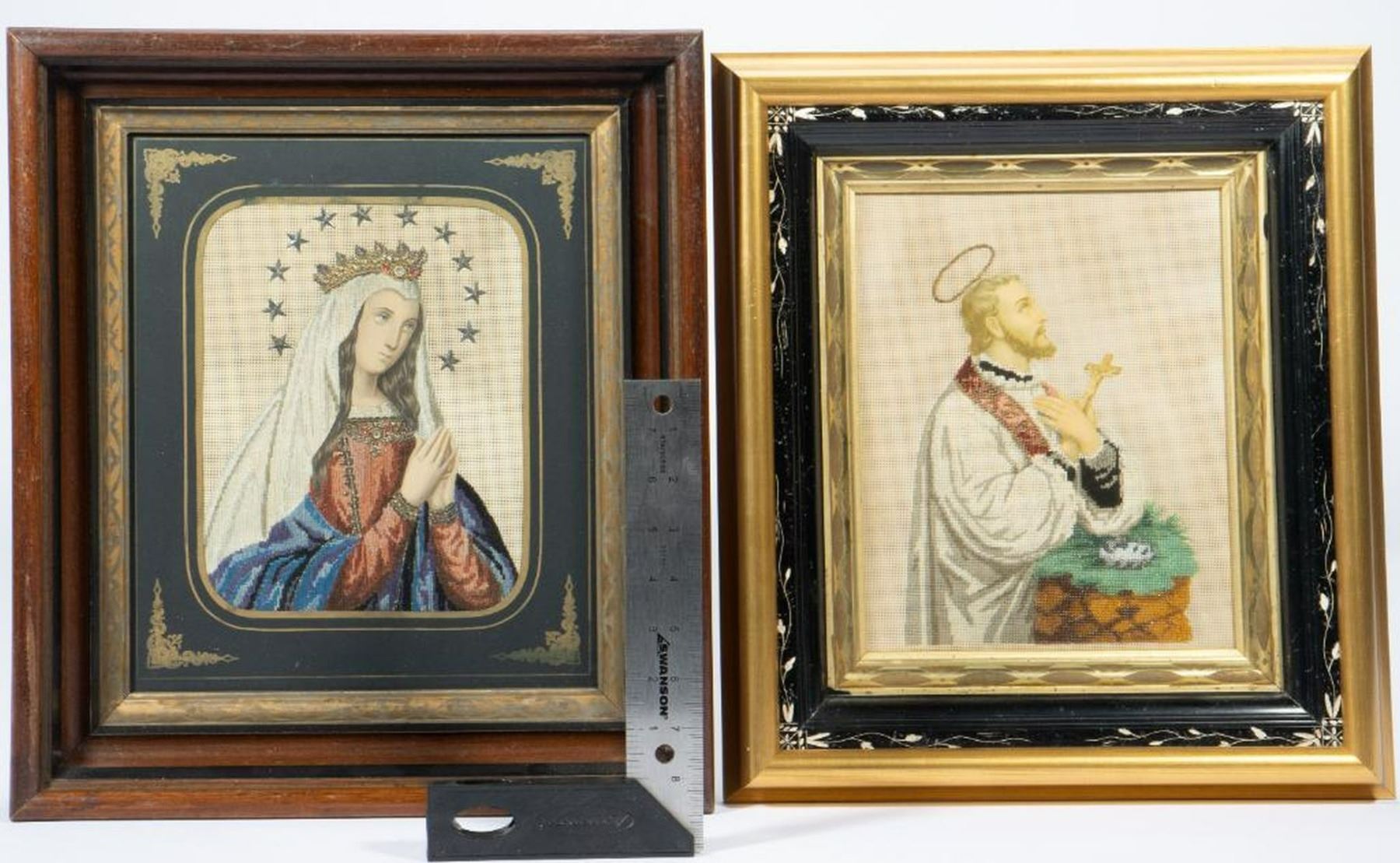 The first Victorian, depicting the Virgin Mary, her face and hands painted/illustrated paper, with sequins and beading; 8 1/2in. x 6 1/2in.; 16 1/4in. x 14in. x 3in. (frame). The second depicts Joseph holding a crucifix, his face and hands cut paper or decal, with beading; 9 1/2in. x 7 1/2in.; 15 1/2in. x 13 5/8in. (frame).