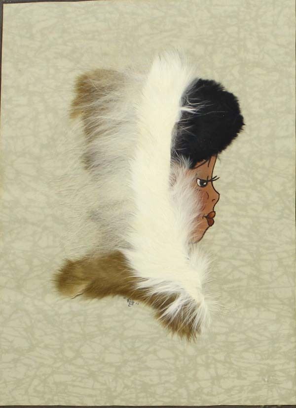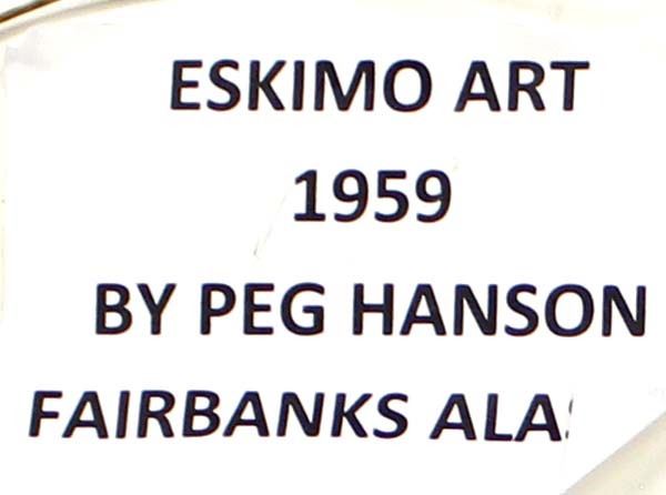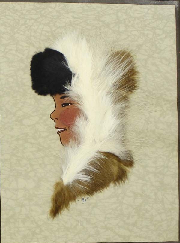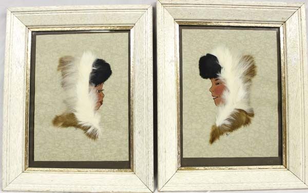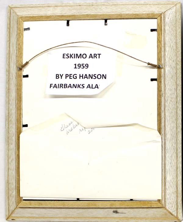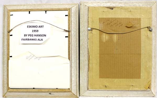 2 Framed 1959 Original Eskimo Paintings by Peg Hanson, both are under glass, overall framed measurement of 12'' x 15'', visual measurement of 8'' x 11'', both are signed ''Peg'', depict Eskimo children in actual fur hoods, very unique paintings