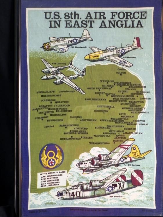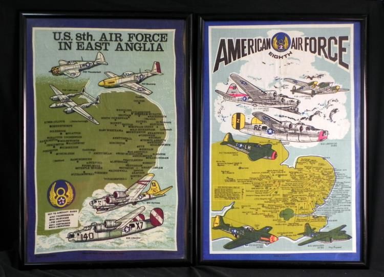 Offered are these 2 Framed Original WWII Tea Towels Made in England. These are of the 8th Air Force. They both measure 31" x 21".
