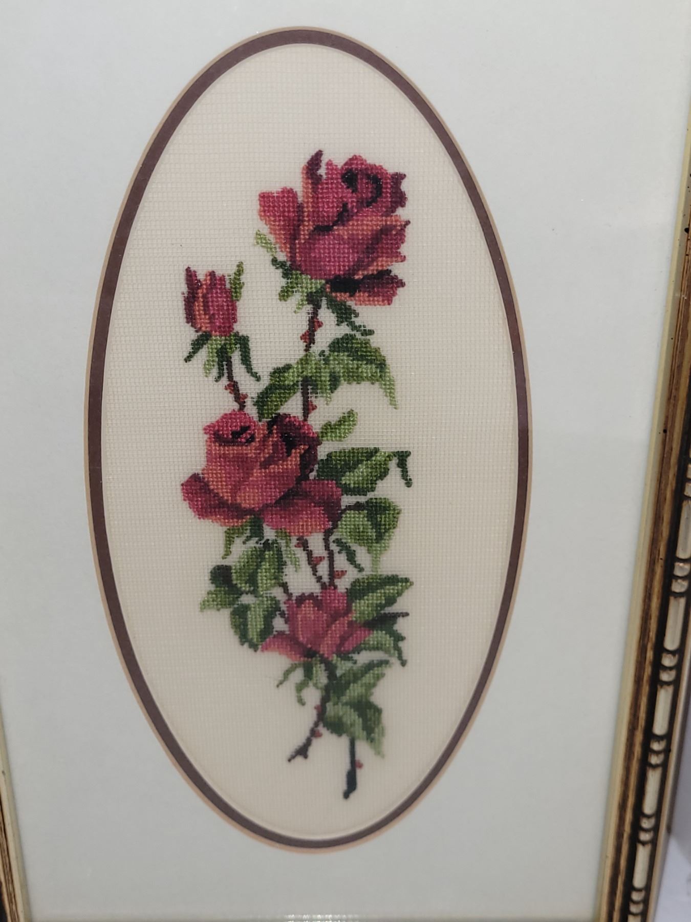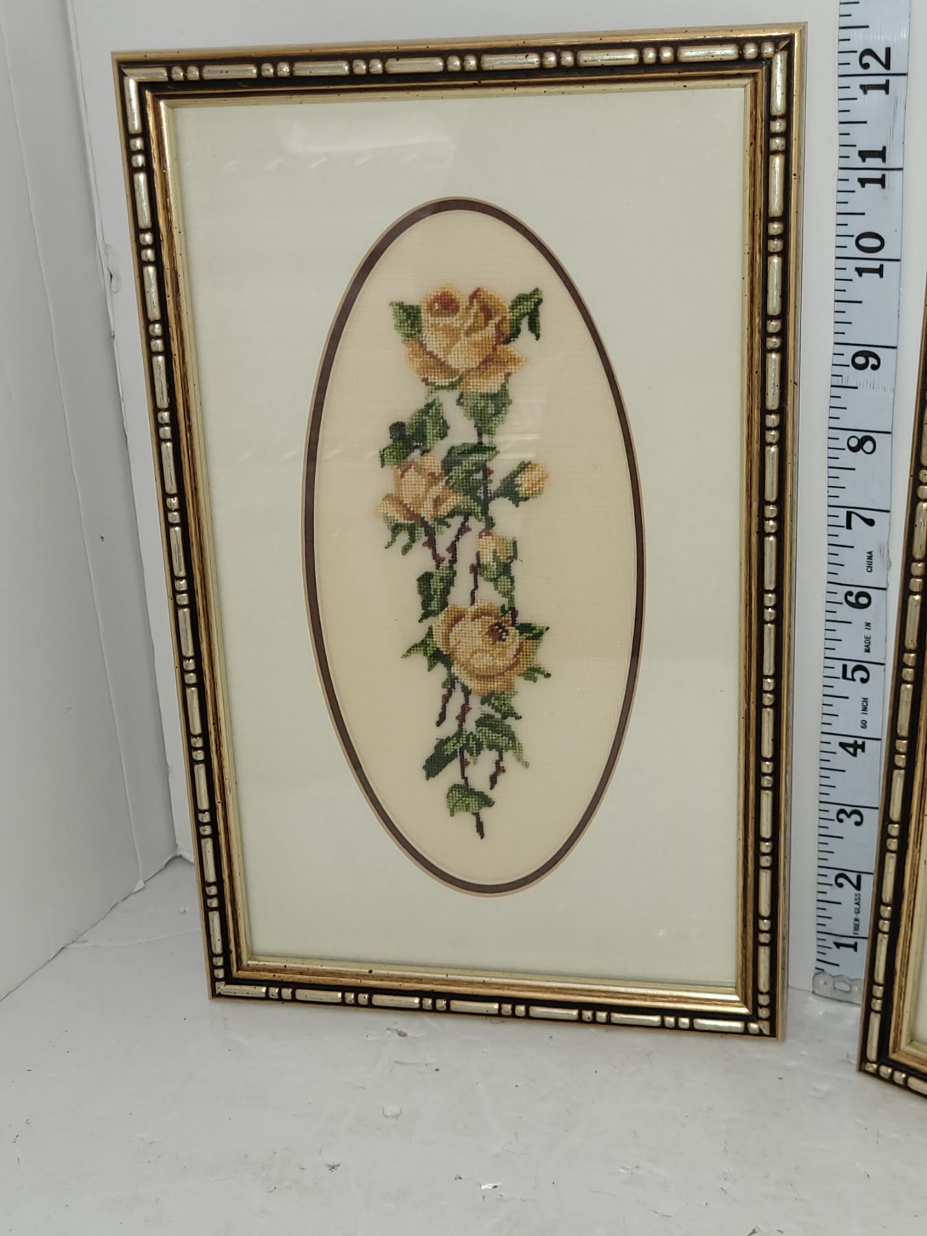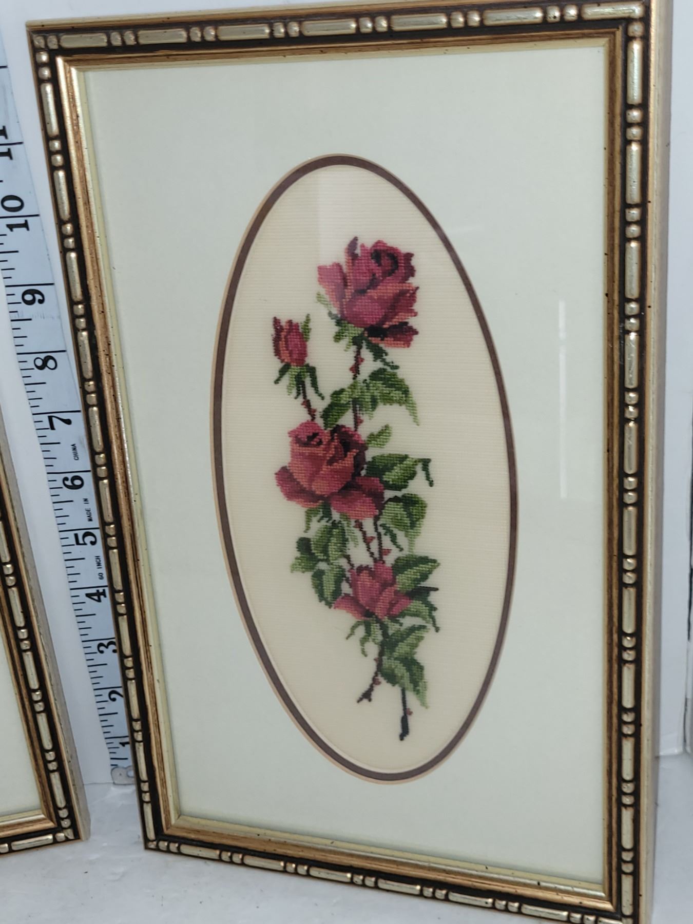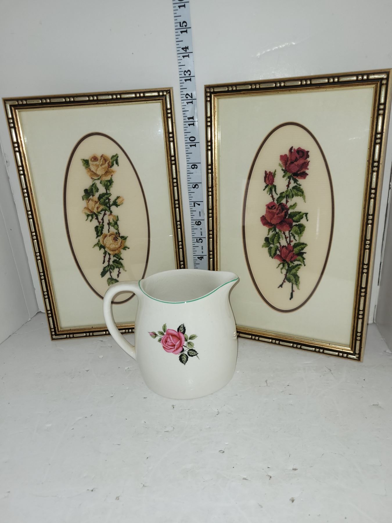 Professionally framed flower petit point pictures, 13" x 4"w. White Ceramic Pot 4"h x 4.75"w, no chips or cracks. Lord Nelson pitcher has a rose on it, 6"w with handle, 4.5"h