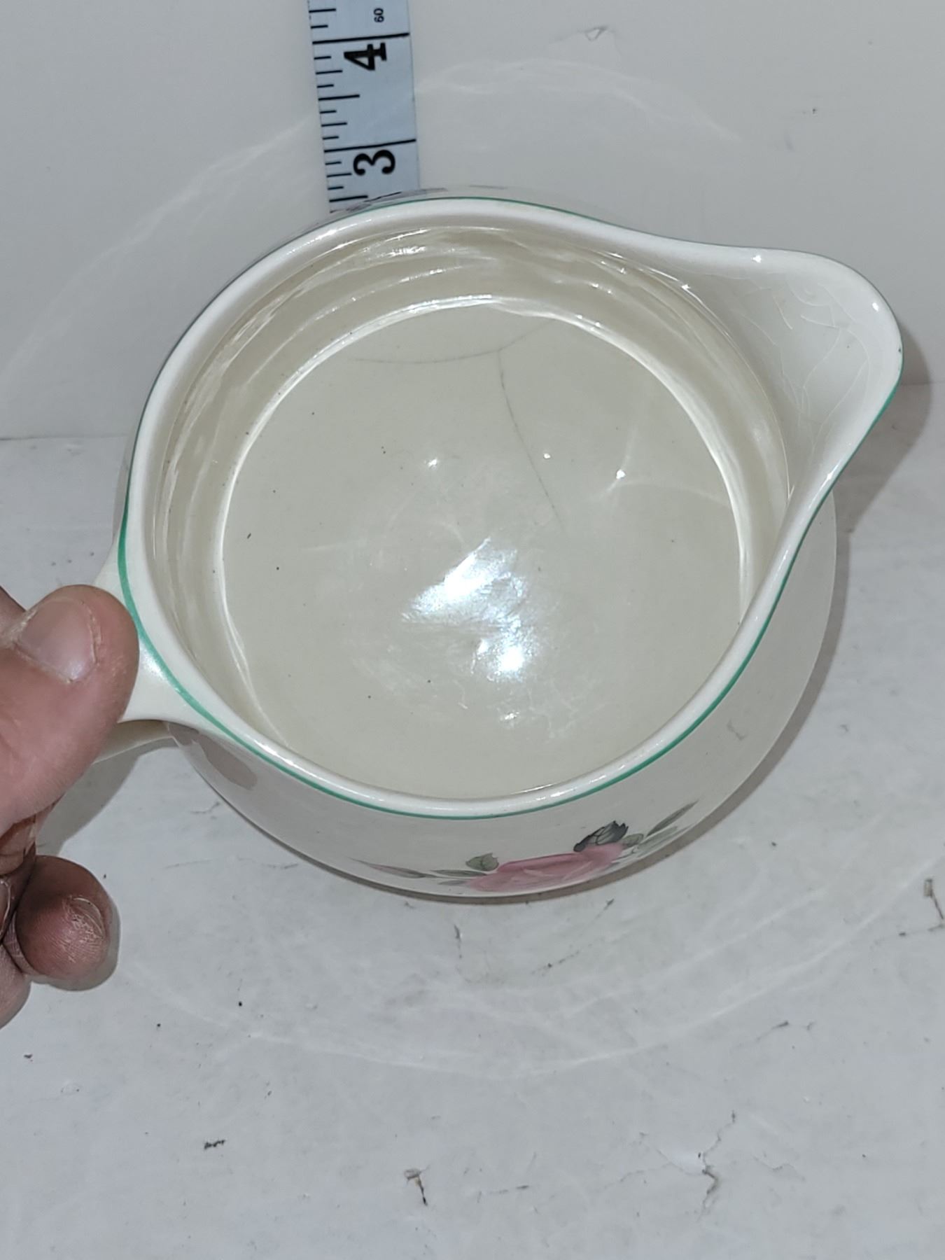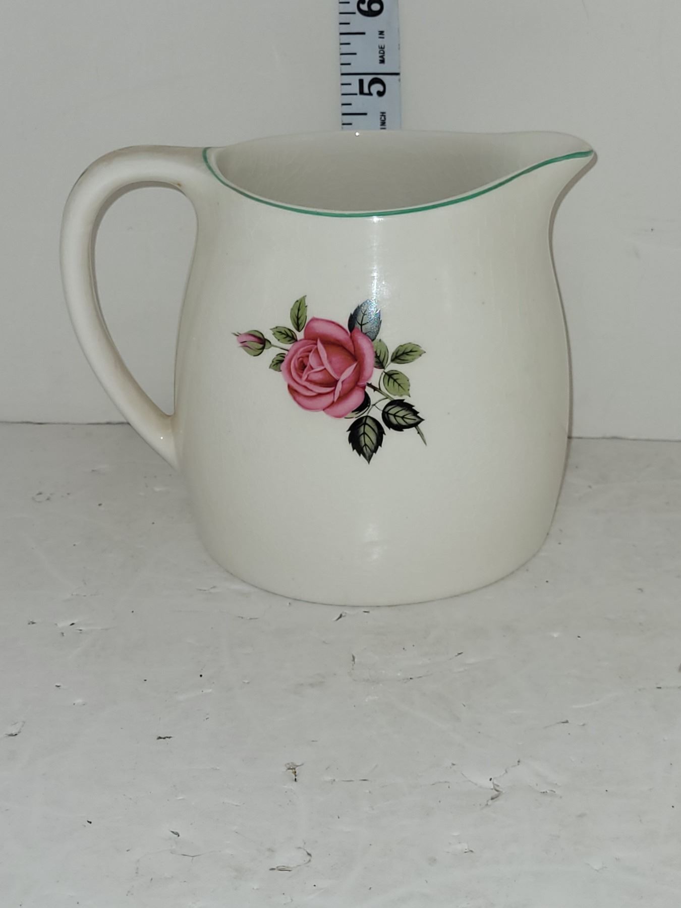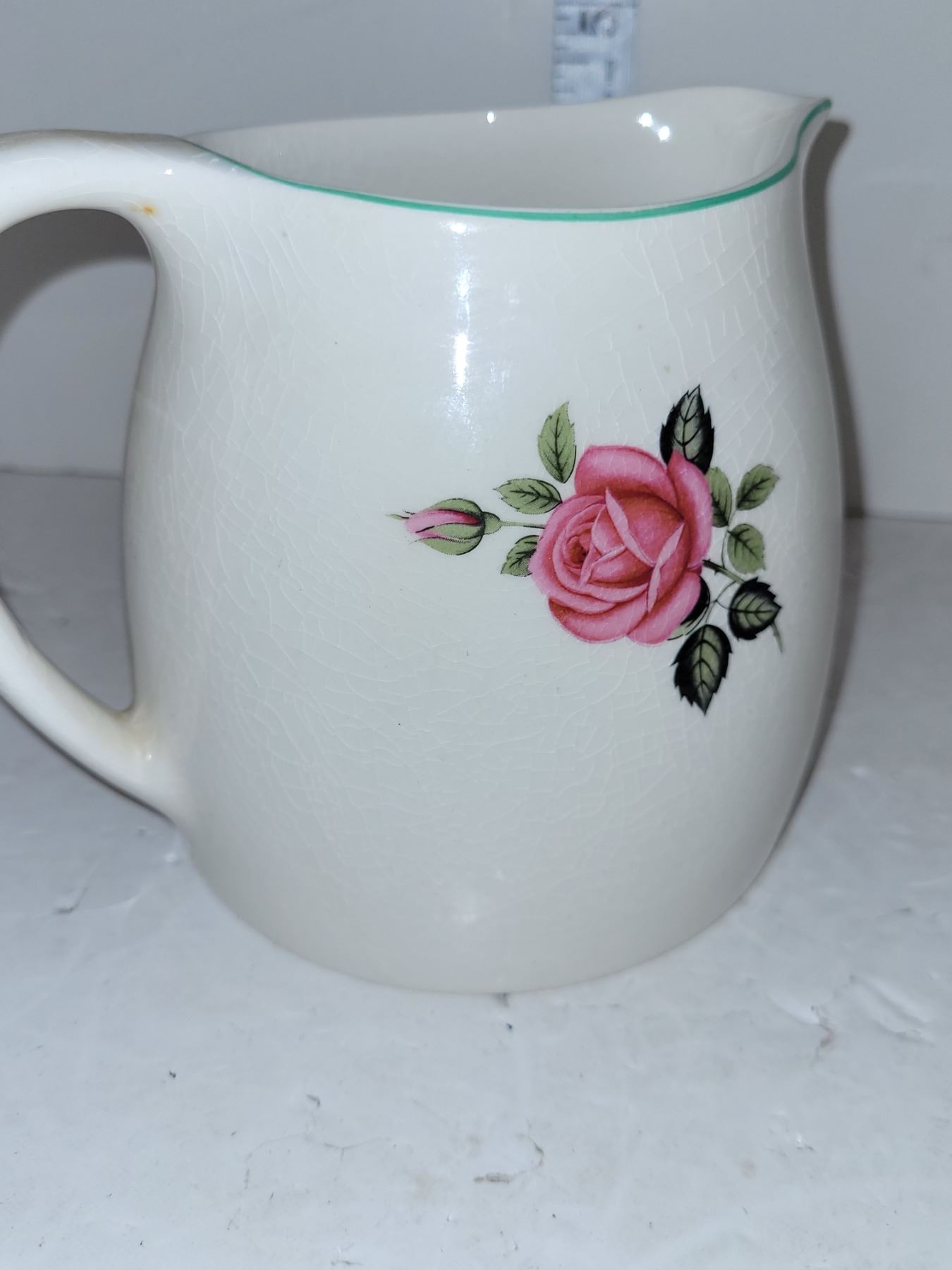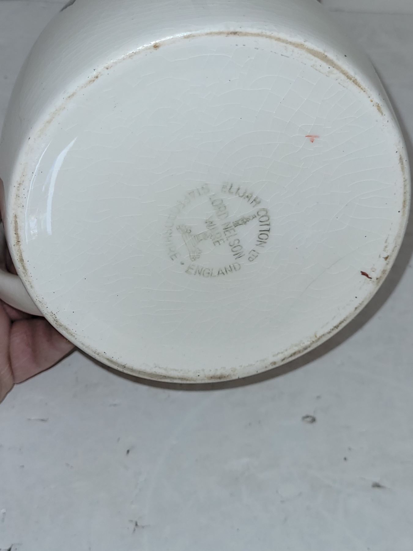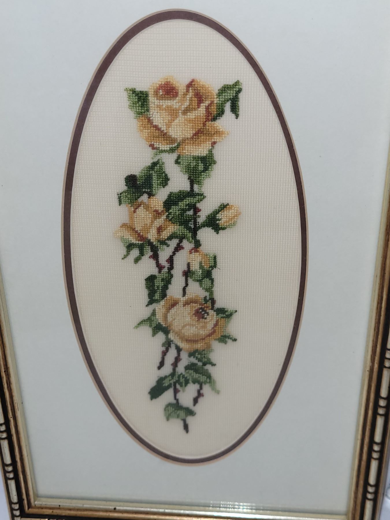 Professionally framed flower petit point pictures, 13" x 4"w. White Ceramic Pot 4"h x 4.75"w, no chips or cracks. Lord Nelson pitcher has a rose on it, 6"w with handle, 4.5"h