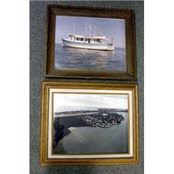 Two photographs. First is an arial view of Marathon, Florida Keys. Second one is on upclose photo of a large private yacht named "Dry Martini." Both in wooden frames, both measure approx. 17" x 14"