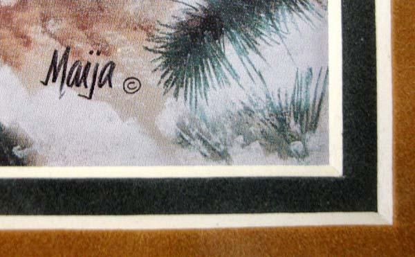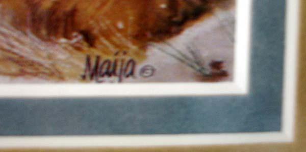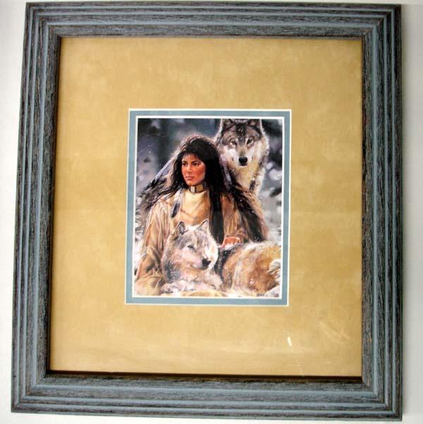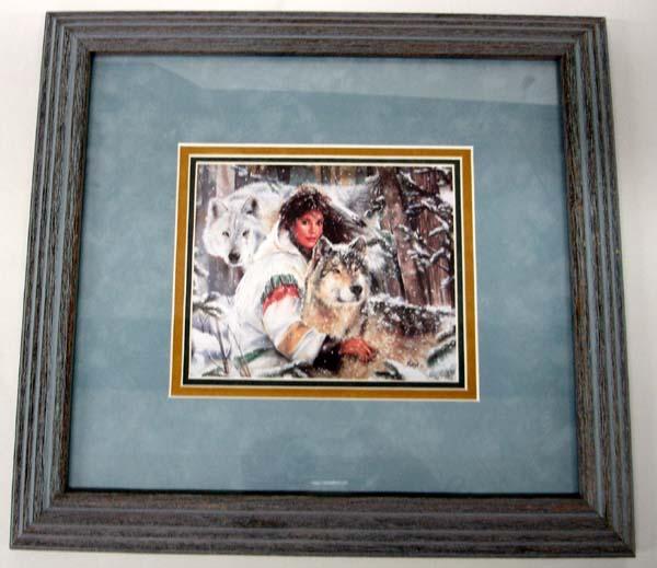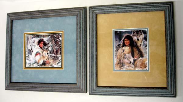 2 Framed Prints of Native American & Wolf by Maija. Each is double or triple matted, under glass in matching wood frames and has a visual measurement of 5''x6.25''. Buyers Pay Actual Shipping and Handling Charges(see terms and conditions for more information).