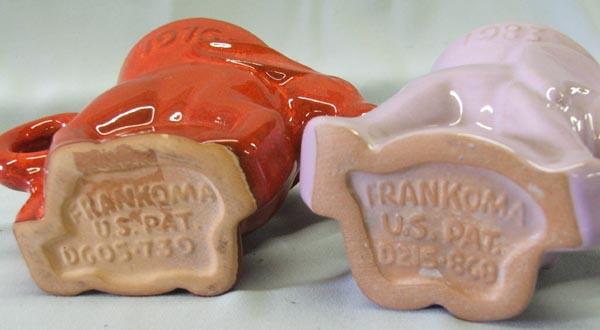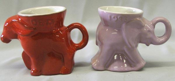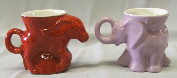 2 Frankoma Political Mugs. The elephant mug says ''GOP 1983'' and the donkey mug says, ''DEM 1976''. Both measure approx. 4''H. Both say Frankoma on the bottom, along with a patent number. SHI $25.