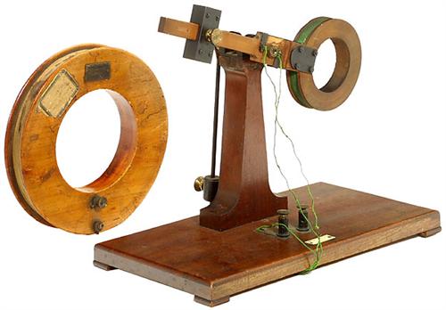 2 French Physical Demonstration Models 1) Induction coil by "Radiguet & Massiot, Paris", on mahogany base (15 3/4 x 7 4/5 in.). - And: 2) Large electrical coil by "A. D. Renard, Clamart, France", Ø 9 1/2 in.<Br>
