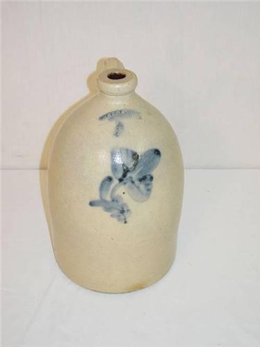 2 GAL. ACK & VAN ARSDALE STONEWARE JUG W/ COBALT FLOWER-MARKED ACK & VAN ARSDALE CORNWALL ONT.;
