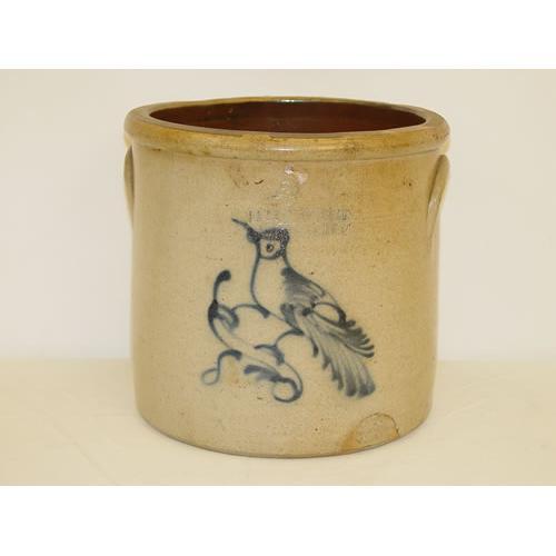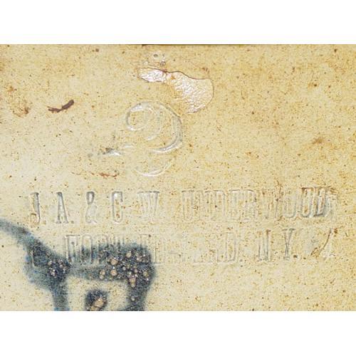 2 GAL. UNDERWOOD STONEWARE CROCK W/ COBALT BLUE BIRD DECORATION-MARKED J.A. & C.W. UNDERWOOD FORT EDWARDS NY (9" T X 9 1/2" W) - SMALL CHIPS TO RIM, IMPERFECTIONS;