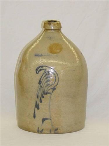 2 GAL. WHITES JUG W/ FLAMINGO - MARKED WHITES UTICA - SEVERAL DIMPLES and POSTONE PINGS IN BACK;